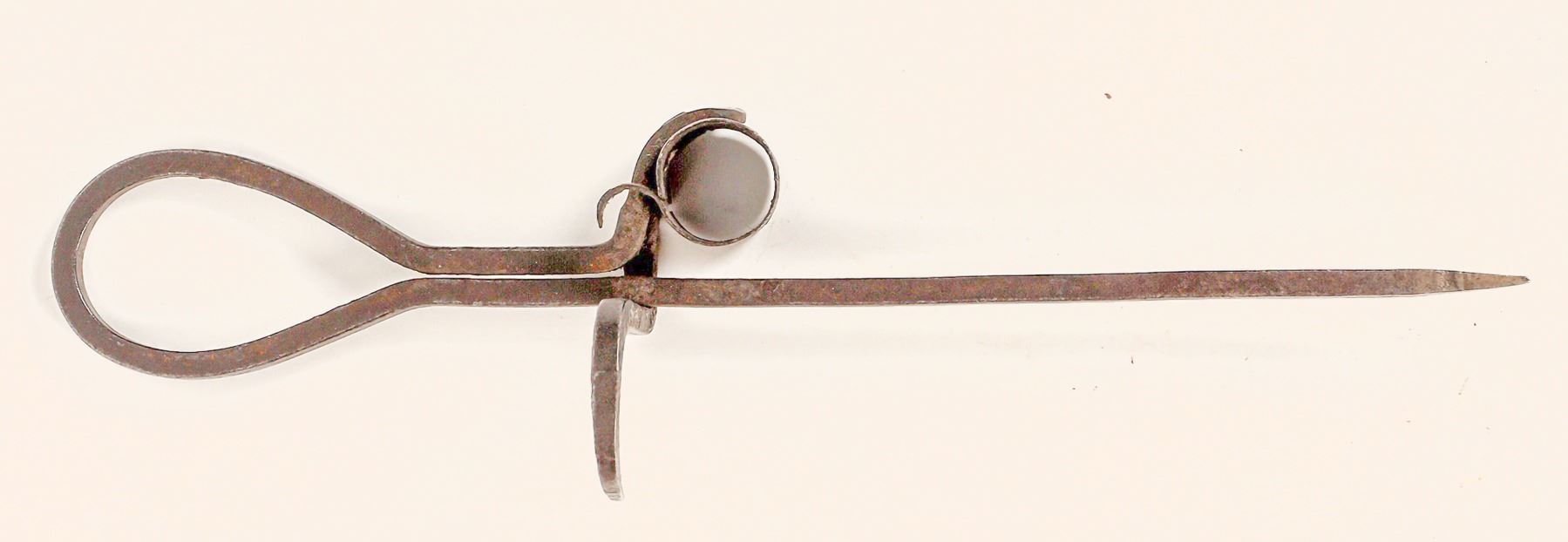 Miner's candlestick. It measures about 10" with a sharp spike. The thimble is slightly loose. Nice piece. Please see photos for more details.[