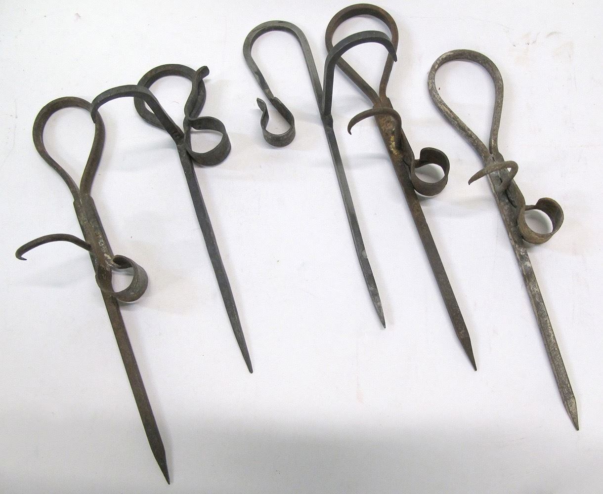 Group of five miners candlesticks, all probably made by different manufacturers. None marked. They range from 8 1/2 inches long to 10.5”. HWAC# 62165 Date: Location: