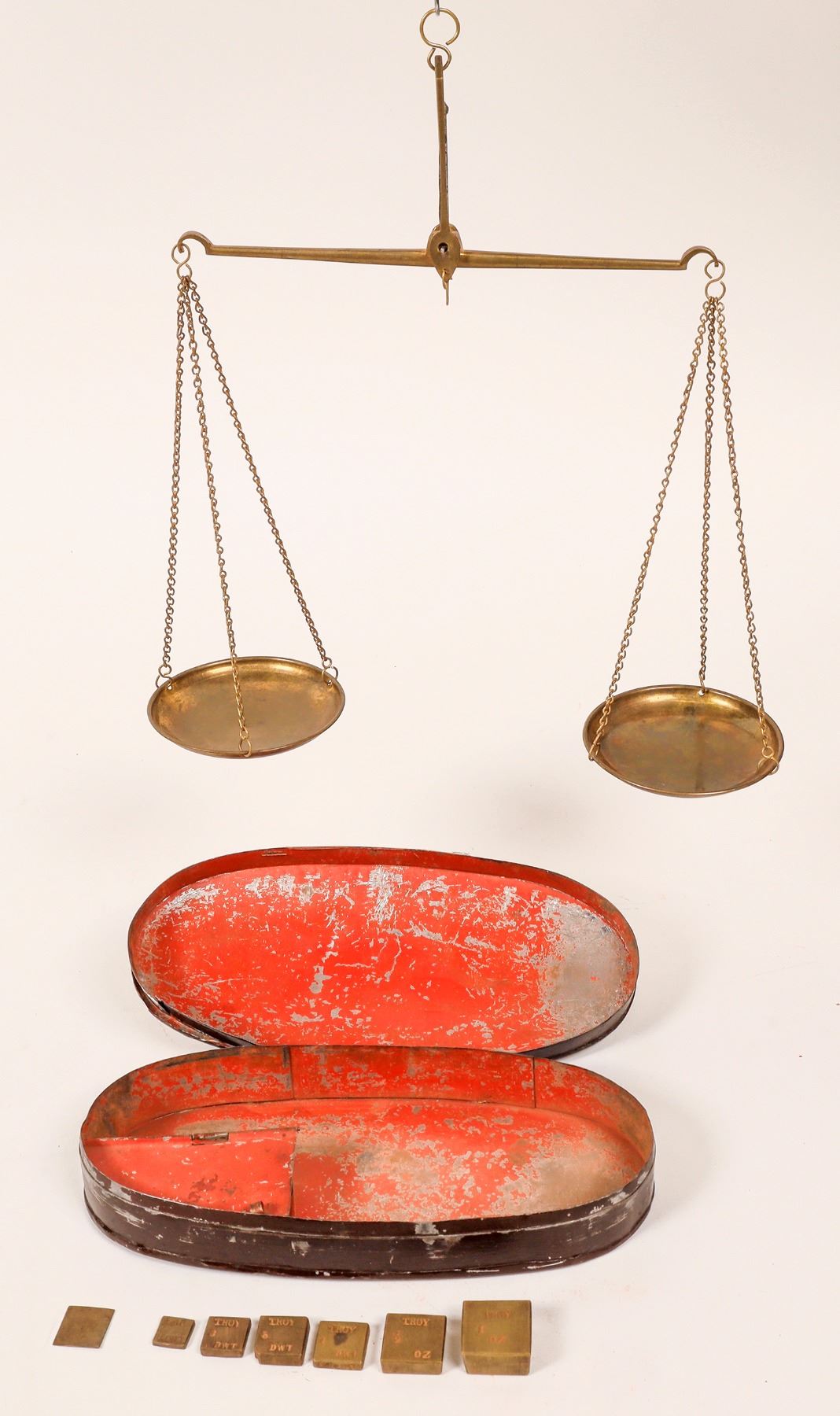 Larger oval brown case 7x3.75".INcludes square 1, .5 Troy oz and 5, 4, 3, 2, 1 and .5 pennyweights, dwt all in a separate covered chamber. Rare find with all original weights. Case has gold eagle on top with minor paint loss. Case has white paint residue and case split in same area. Base of hinge is loose at case.