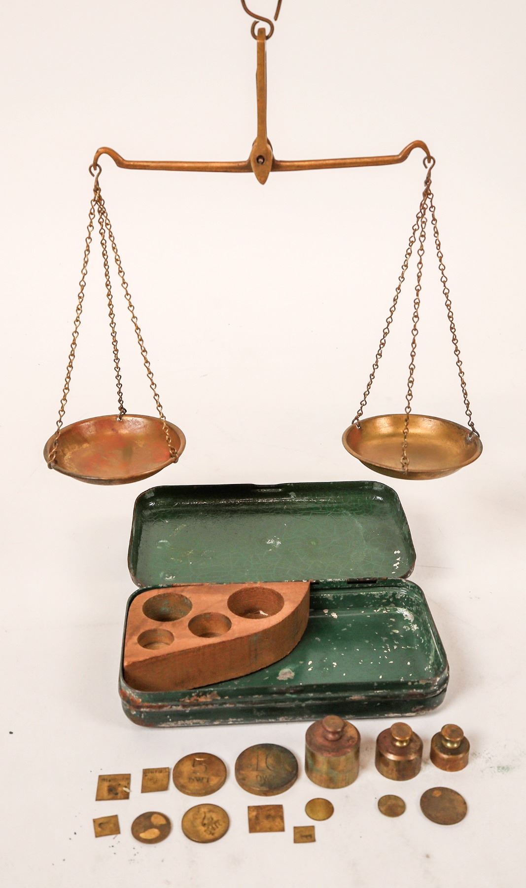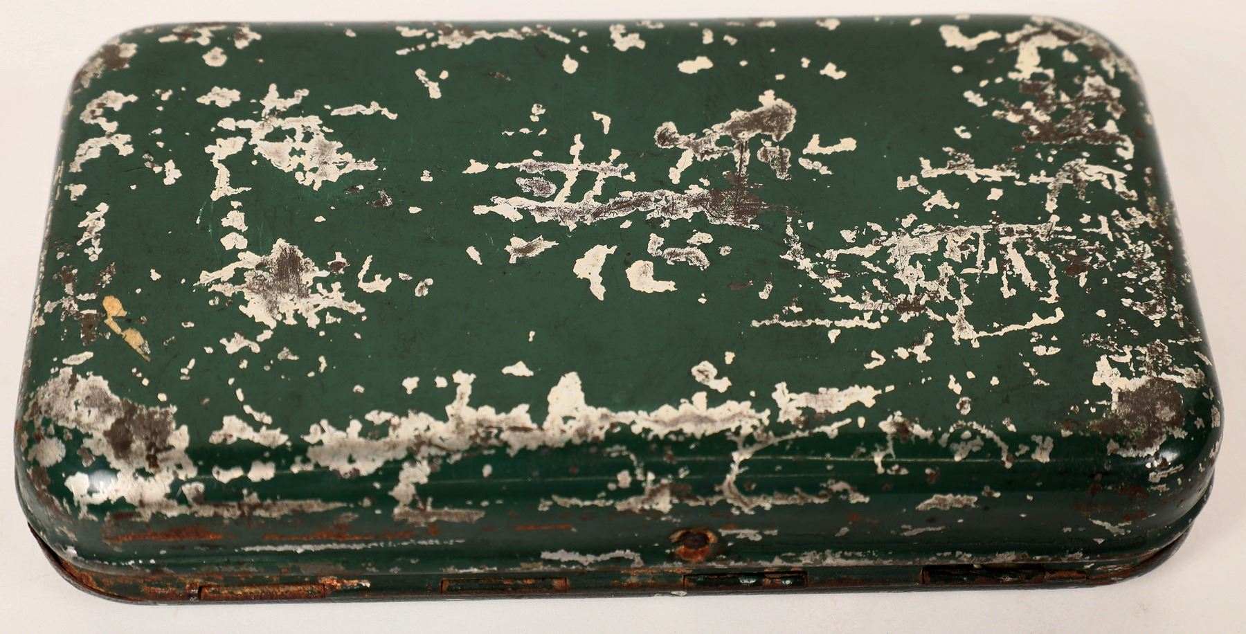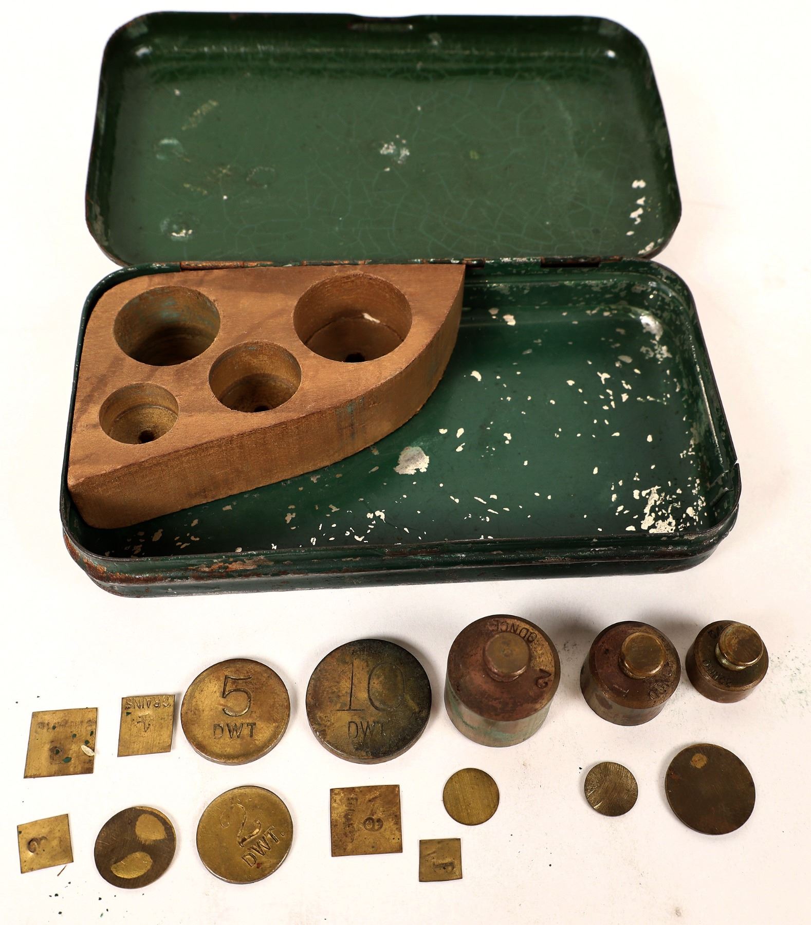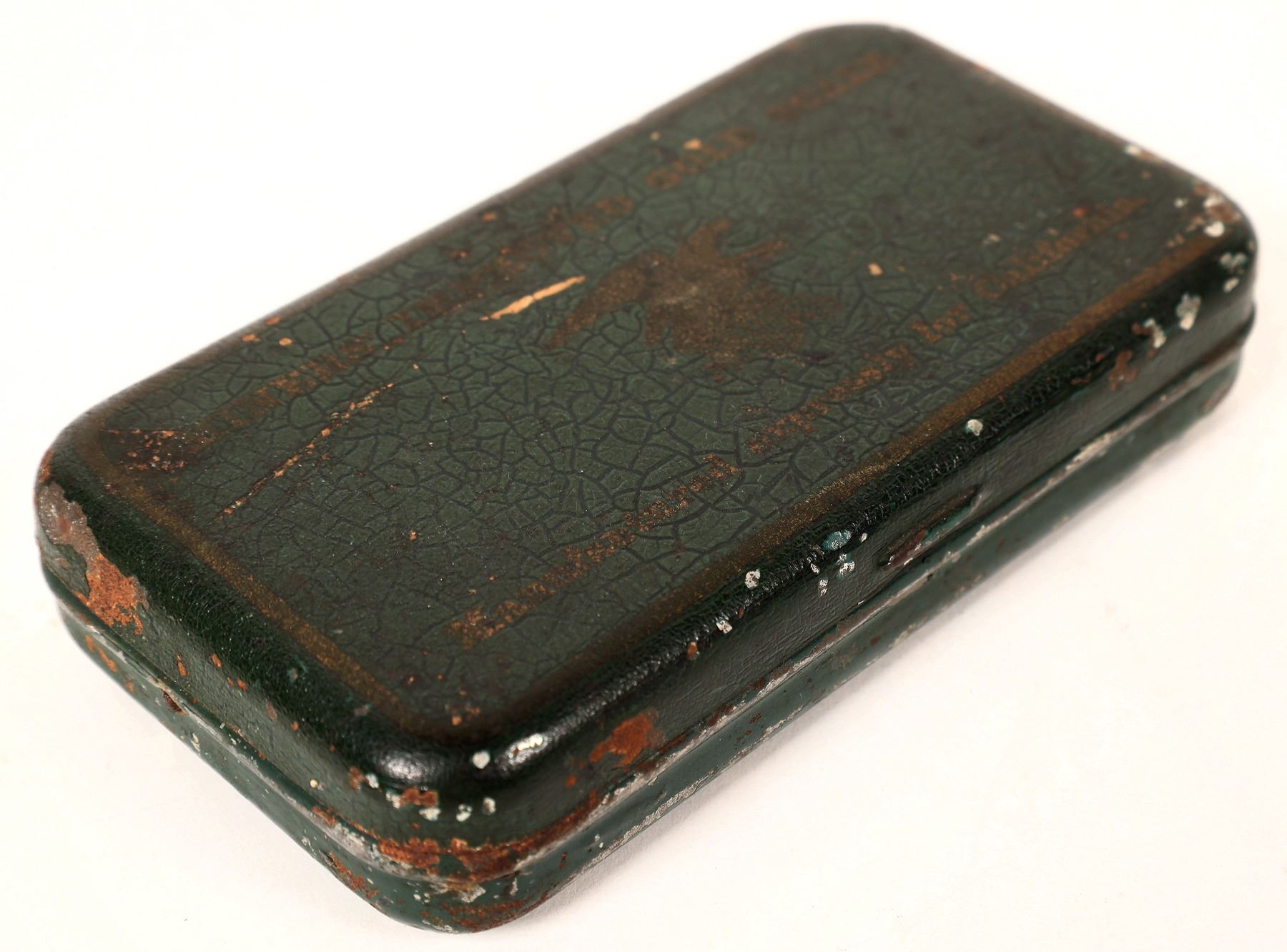 Manufactured expressly for California, green rectangular aluminum case. Includes 2, 1, 1/2 Troy oz. and pennyweights 5, 2, 1, .5. Grain weights, 6, 5, 4, 3. All weights nested in wood insert. Gold eagle on top of case, 5.25x3.5". Some paint chips.