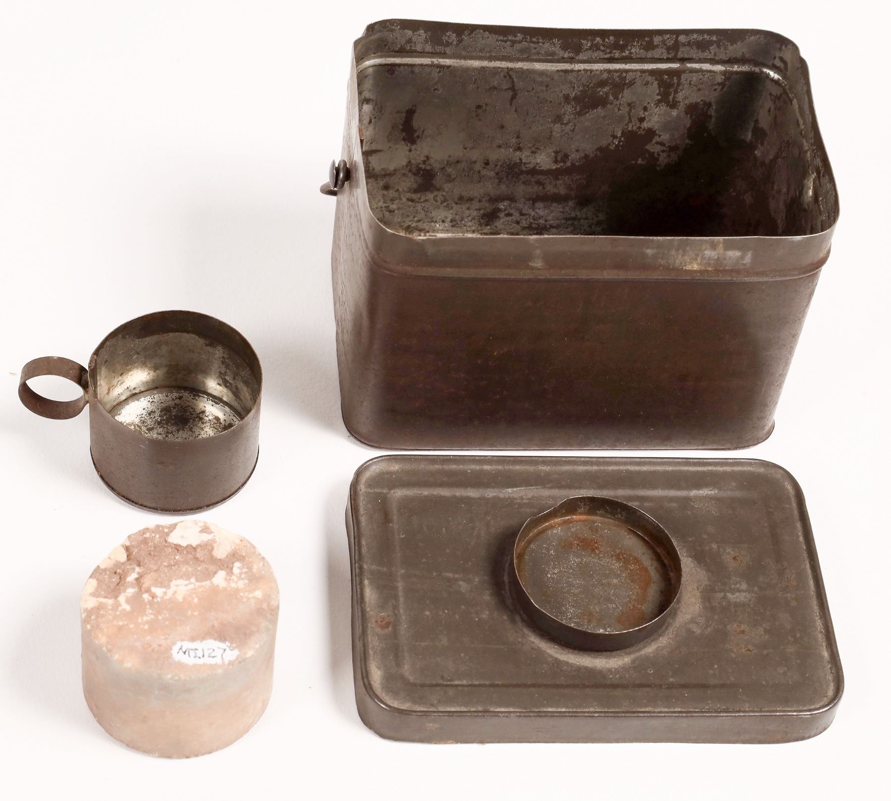 Cute little store sample miner's lunch box, stamped on bottom-Pat'd May 17 1887 3.5x3.75x2.5". Circular stone with concave top, unknown purpose. 1x1.5", bottom chip.