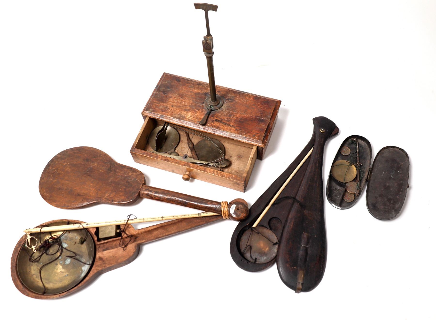 Wood sliding style scale, possible bone beam, missing weight, 12x3". 19th century , no maker mark brass scale without weights on wood bases with drawer 10x9x4". Fantastic rare Chinese sliding scale, cello shape, with bone beam, possibly from Tombstone c. 1880's. Jim & Barbara Sherman Private Western Mining Museum