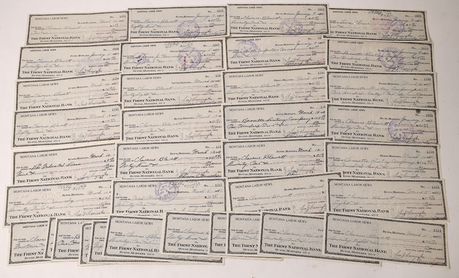 Miner's Union newspaper checks Montana Labor News out of Butte, Montana. Dated c. 1940. Over two dozen. Hole punched as paid. Montana Butte