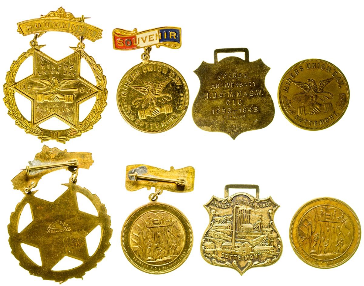 Four pieces from the I. U. of M. M. & S. W. CIO. Includes 2 pin medals, 1 fob, and 1 token. All in excellent condition. See photo for details. (Svoboda Collection) City: Butte State: Montana Date: HWAC# 35941