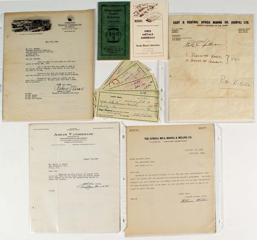 Eleven items. 1) Limestone Products of Newton, New Jersey. "Please be sure that your group is ready to sign the releases..." 2) State of New Jersey about the two quarries near Sparta Junction. 3) Bethelehem Steel talking about an excursion to their plant. 4) Abram Vandermade of the Sowerbutt Quarries "...we are sorry that we cannot grant your requests as we are not permitting anyone to enter our quarry." Also Consolidated Feldspar, Eureka Mica Mining granting permission for an excursion. A letter from the East & Central Africa Mining Co. (Kenya) selling beryl and corundum. Finally some 1963 checks for mineral purchased, a mineralogist's pocket reference guide, and an assay sheet metals and minerals by the Nevada Mineral Laboratories. Date: c1940 Location: United States HWAC# 38028