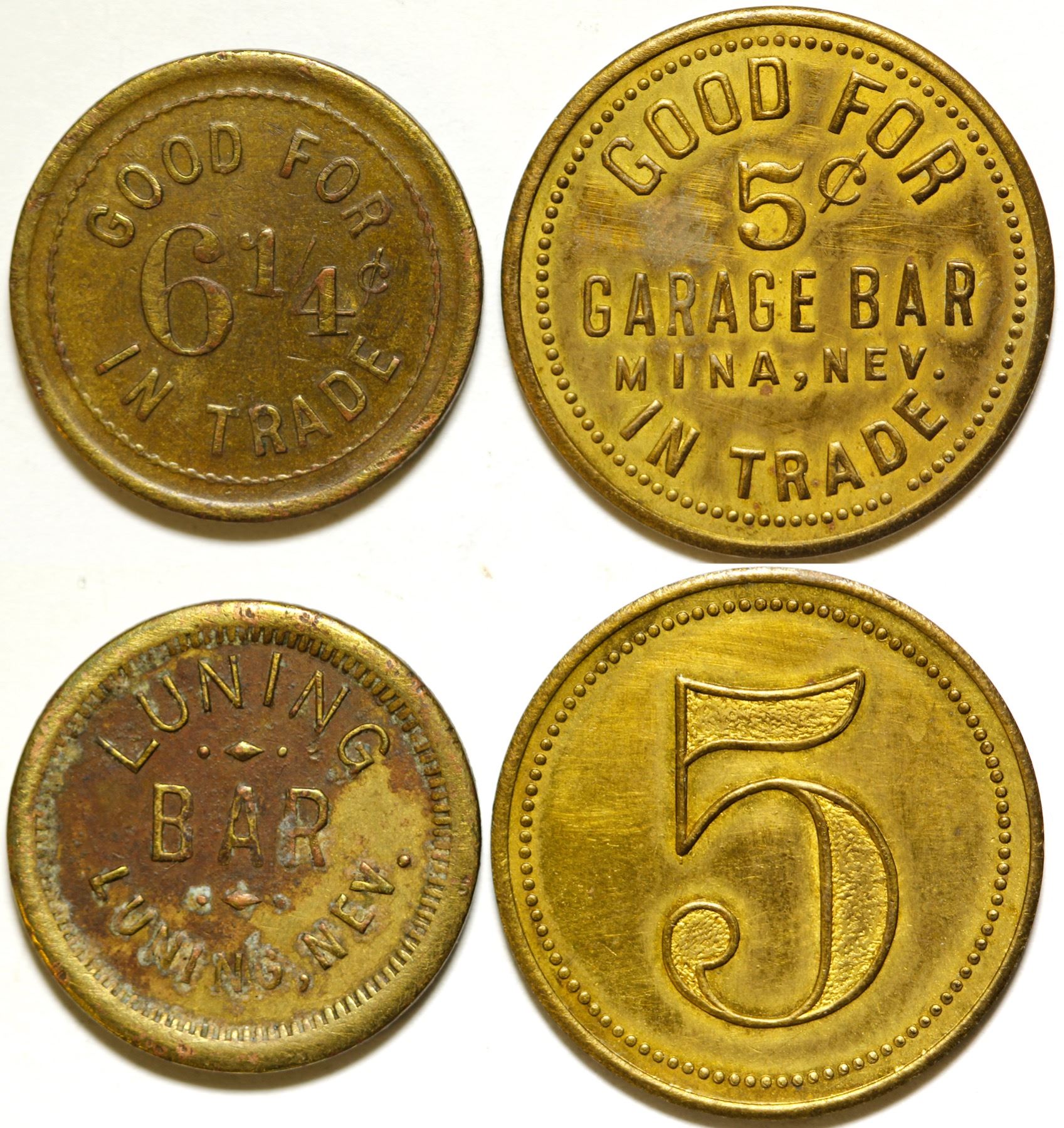Lot of two: 1) Obv.: Good for / 5c / Garage Bar / Mina, Nev. / In Trade; Rev.: 5. Br., rd., 25 mm. 2) Obv.: Luning / Bar / Luning, Nev.; Rev.: Good For / 6 1/4c / In Trade. Br., rd., 21 mm. State: Nevada City: Mina/Luning Date: HWAC# 84315