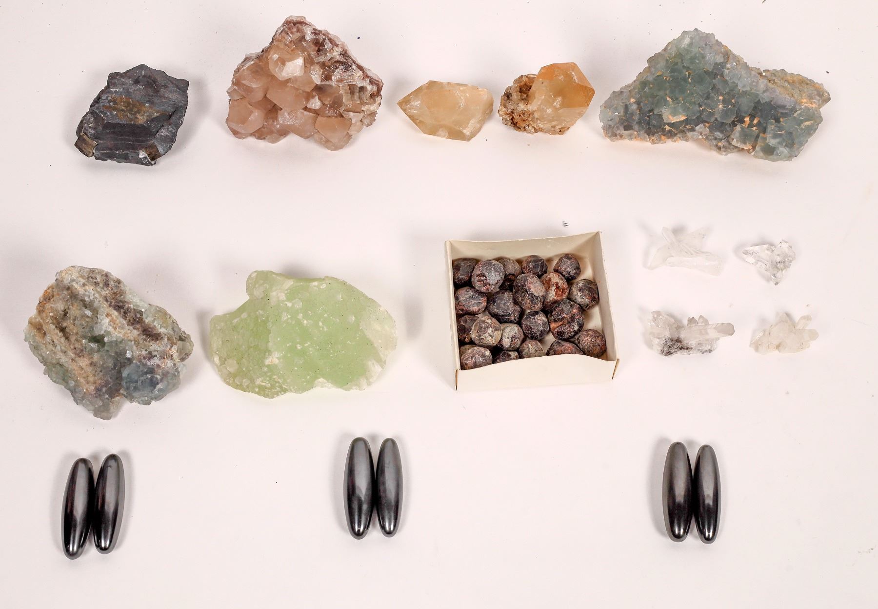Pale blue-grey fluorite cubes up to 3/4" across, 6 x 3.5 x 2.85"; pale yellow-green, single fluorite crystal with irregular surface detail, 5 x 3 x 2"; four small clusters of intersecting quartz crystals, from 1.5 x 1 x 1" up to 2.25 x 1.25 x 1.25"; two single quartz crystals, one varies from clear to yellow (citrine) 3 x 2.25 x 1.25", the other is pale citrine throughout, 2.5 x 1.5 x 1.25"; about 21 pyrope garnets from 1/2" to 3/4" in diameter, 332 gr; two pyrite cube, 1/2" and 3/8" across, both in black slate matrix, 3 x 2.75 x 1.25"; pale pinkish-tan hobnail calcite crystals up to 1" across on white matrix, 4.5 x 3.5 x 2"; water-clear, pale green to pale purple fluorite crystals up to 1/2" across, 4 x 3.25 x 2.5"; three pair of natural magnetite "Rattlesnake Eggs" in two-part, blue, windowed gift boxes. Localities unknown. China Chunlin Zhu Collection