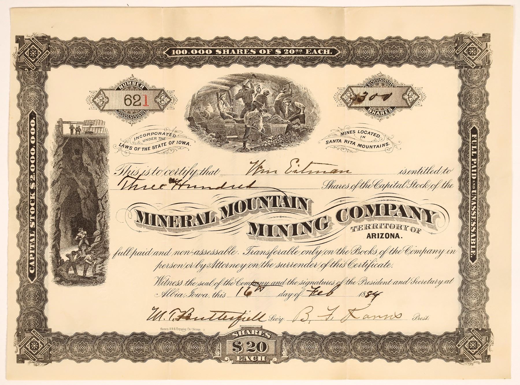 Cert. #621, issued for 300 shares to Wm. Eitman in 1884. Signed by B.F. Kanns as president and secretary WT Butterfield. Mines Located in Santa Rita Mountains noted on the certificate. This was in Pinal County, Arizona. Two nice mining vignette of miners working underground. Mines were south of the Gila River at Cottonwood Canyon on the west slope of Mineral Mountain. Western Bank Note. Folds, otherwise fine. Uncanceled.