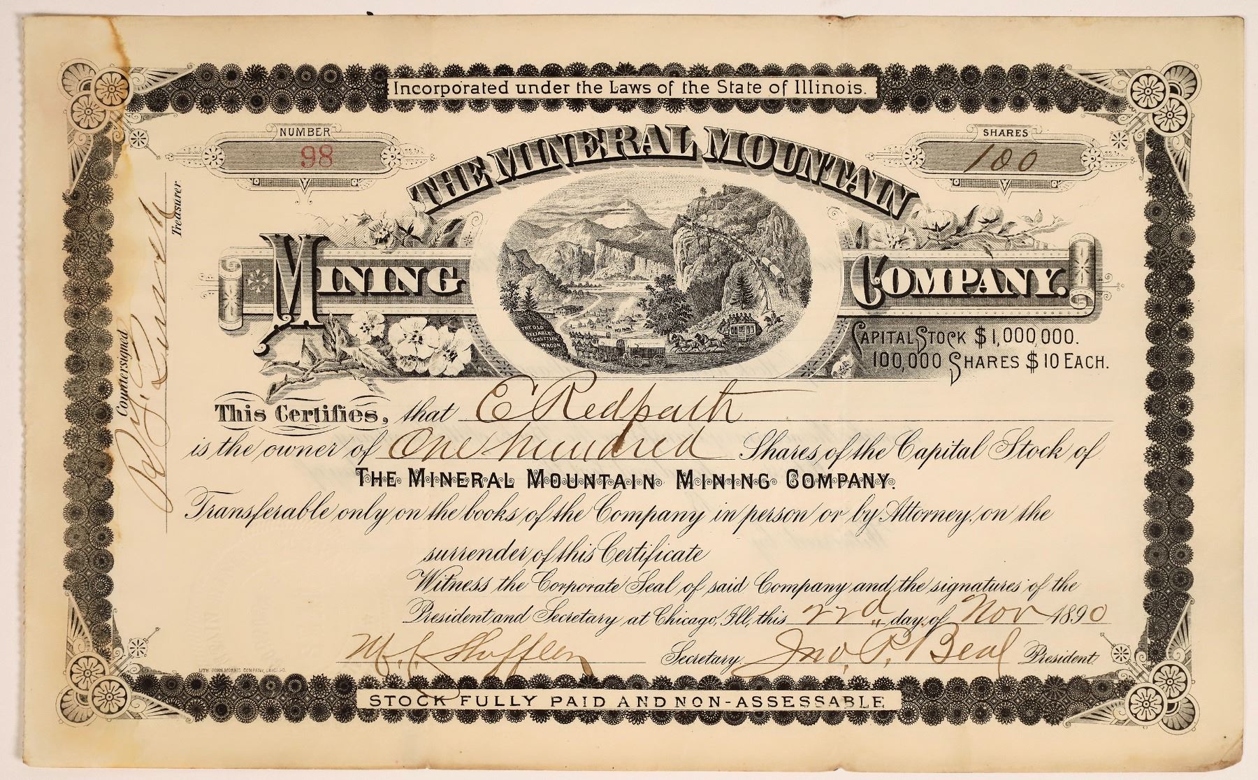 Not to be confused with earlier Mineral Mountain Mining stock. Although later, 1890, this is harder to find. #98 for 100 shares to E Redpath. Signed by secretary Shiffer and president Beal. Unique and interesting vignette of "The Old Reliable Schuttler Wagon" train heading down a mountain trail. Stain along left border.