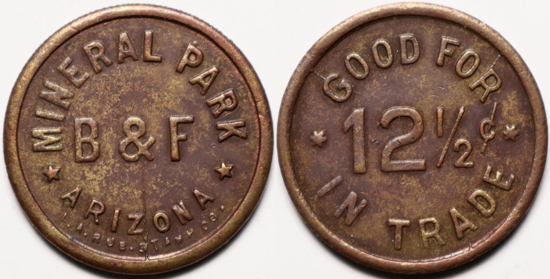 Mineral Park/ B & F /Arizona // Good for / 12 1/2c / in trade. Br, R-10. Mineral Park's post office was established December 31, 1872 and discontinued June 15, 1912. Mineral Park was layed out in 1871 and became the biggest settlement in Mohave county, eventually becoming the county seat.