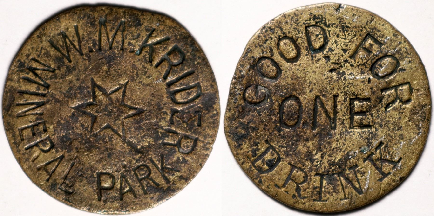 W.M. Krider /Mineral Park // Good for / one / drink. Round, al, R-8. Mineral Park's post office was established December 31, 1872 and discontinued June 15, 1912. Krider is listed as the Post Master for Mineral Park and as operating a Livery/Stable in the early to mid 1880s. Mineral Park was layed out in 1871 and became the biggest settlement in Mohave. There are many ruins left today and are under the protection of the GT mining company.