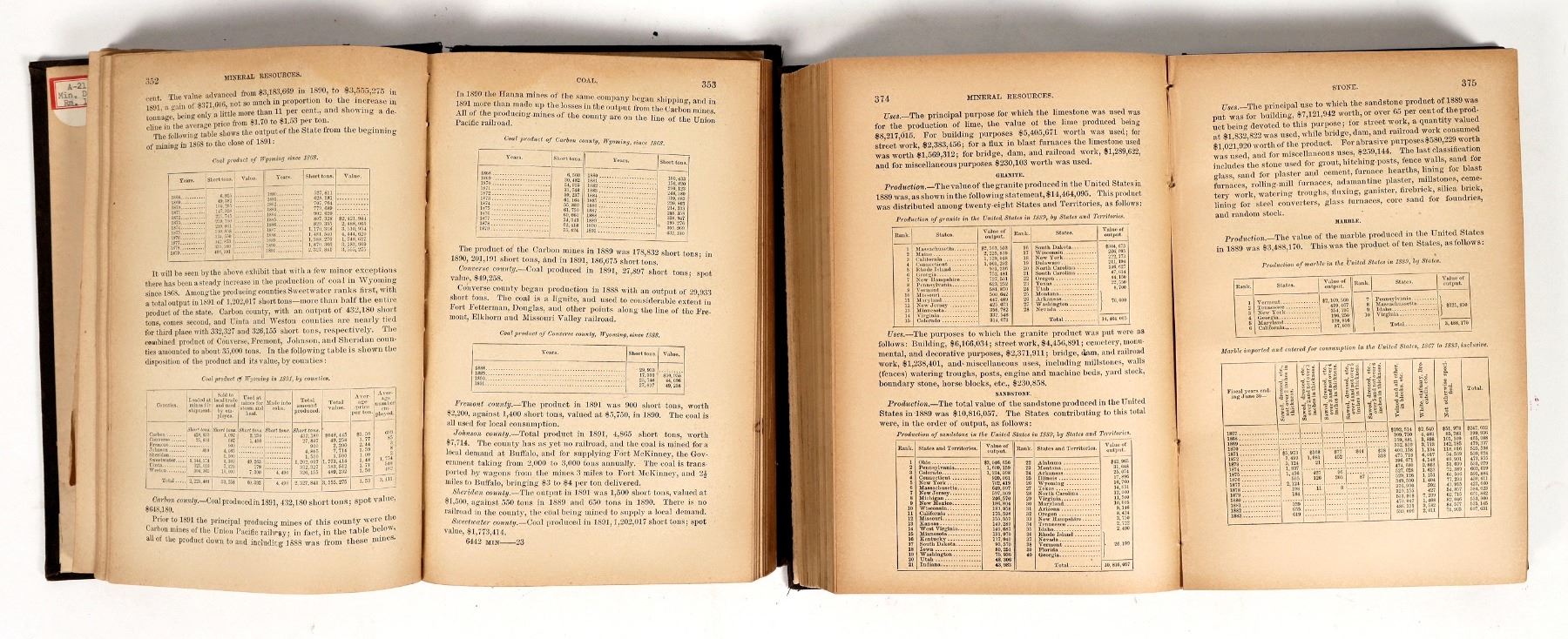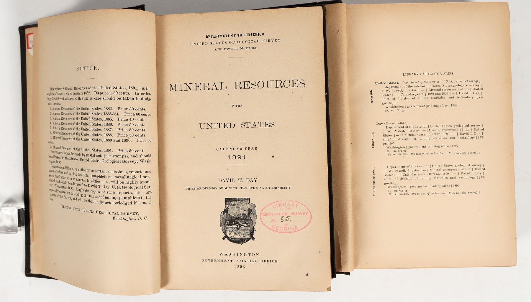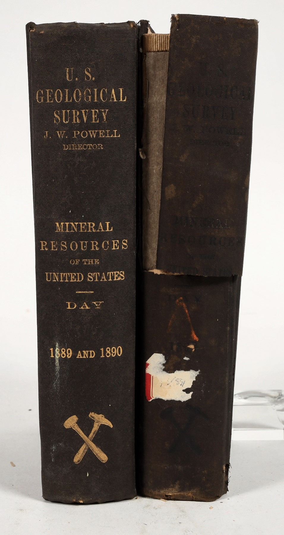 Two volumes of "Mineral Resources of the United States" by David T. Day, published by the U.S. Department of the Interior as part of the U.S. Geological Survey. Includes the report for the years 1889 and 1890 (pub. 1892) and the report for the year 1891 (pub. 1893). Excellent reference books for researchers/historians of American mining. Both hardback in original fabric binding. The 1889-1890 report is in excellent condition, and the 1891 report is in rough condition with a largely detached spine; see photos.