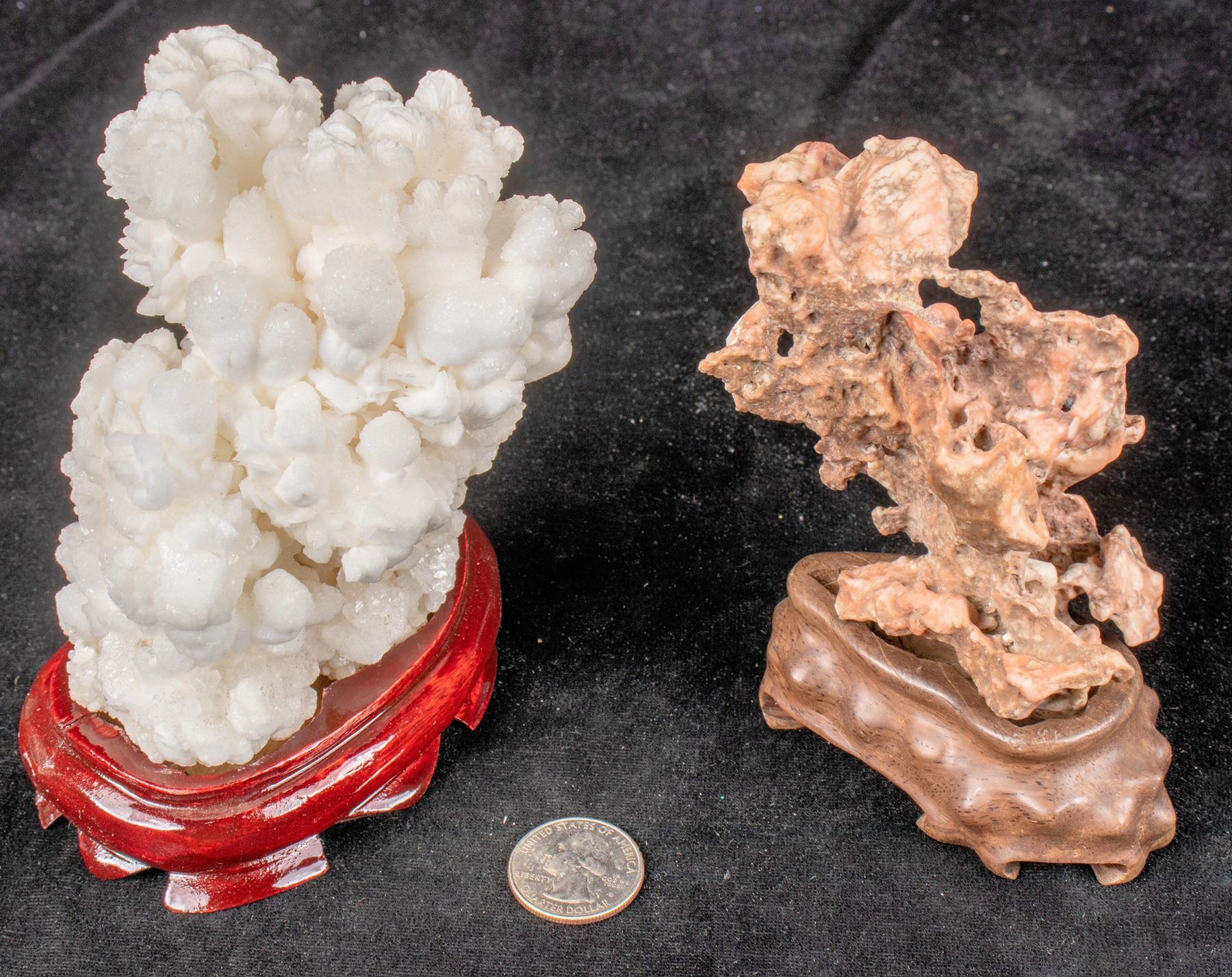 2 specimens with bases. Includes Gobi stone intricately wind carved chalcedony 4.5 x 3 x 2 ; stalactitical calcite cluster coral like structure white finely crystalline 4 x 3 x 3 State: City: Date: Provenance: Chunlin Zhu Collection