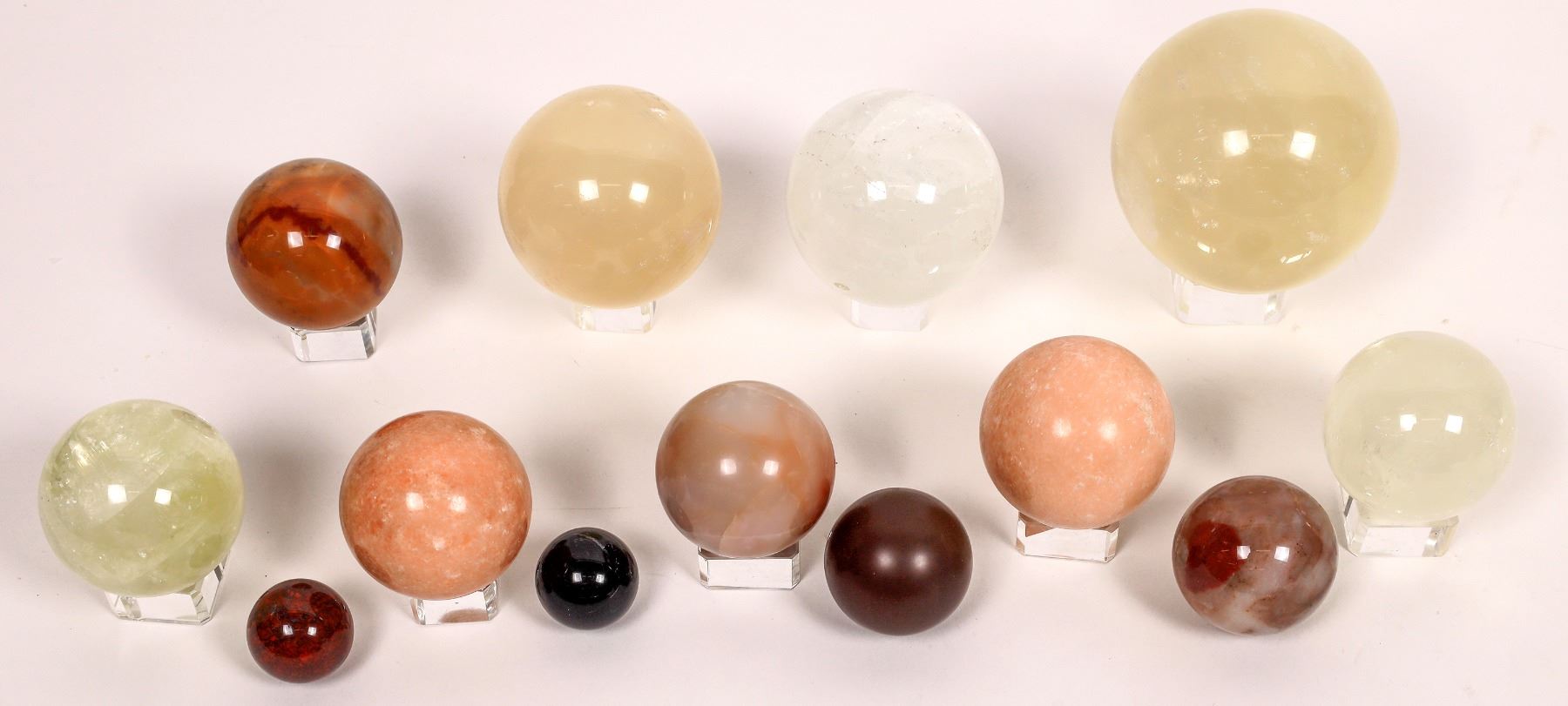Polished spheres mix: translucent calcite: one 3.5", one 2.8", one 2.75", one 2.25", one pale yellow-green 2.3"; two salmon crystalline marble, 2.3" and 2.25"; one orange chalcedony 2.1"; two white and orange-brown chalcedony 2.1" and 1.9"; one brown matte jasper 1.75"; one black chalcedony 1.2"; one red iron jasper 1.2"; includes 9 clear lucite square bases: one 1.3", four 1.2", four 1.0". China Chunlin Zhu Collection