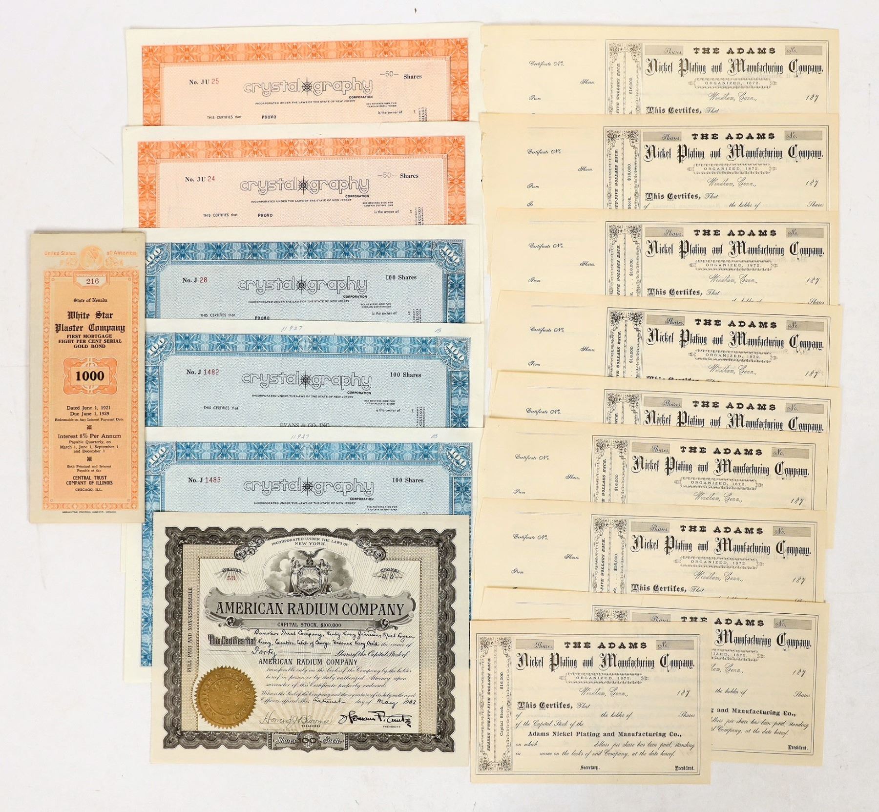 Issued-2x orange 1972 and 3x 1972-73 blue crystal*graphy, 1x 1893 American Radium, 1921 White Star Plaster bond. Unissued-9x Nickel Plating and Manufacturing.