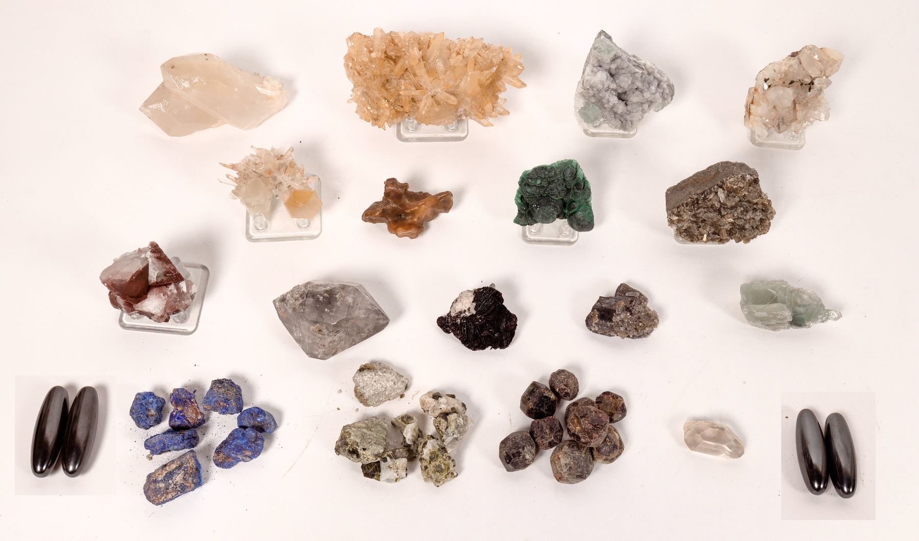 Seven pieces of epidote crystals with white quartz, each about 3/4" to 1" across, 113 gr; joined pair of clear quartz crystals, 4 x 2 x 2.25"; pale blue fluorite cubes, up to 5/8" across with light grey druzy quartz on white matrix, 3 x 2.5 x 1.5"; spiky cluster of iron-stained quartz crystals, 5 x 2.5 x 2"; pyrite crystals on a tan assemblage of dolomite(?) and quartz crystal, 3 x 2 x 1.5"; dogtooth calcite scalenohedrons both clear and ruddy brown2.25 x 2.25 x 2"; spiky cluster of small quartz crystals with a few larger quartz crystals, 2.5 x 2.0 x 1.5"; large Herkimer Diamond (doubly-terminated quartz crystal) with heavy inclusions, including a bubble marked with a black circle, 3 x 2 x 1.75"; black, tabular clusters of hematite crystals, with small clear quartz crystals, 2 x 1.75 x 1.25"; heavy streaky black mineral, no cleavage (black tourmaline?) with thin, disklike calcite crystals and pyrite,1.75 x 1.5 x 0.75"; botryoidal malachite2.25 x 2 x 1"; pale blue, clear fluorite cubes, up to 1" across, with 2.5 x 1.5 x 1"; cluster of clear quartz crystals with flecks of dark green epidote, 2.5 x 2 x 1.5"; "Gobi Stone" chalcedony, 2.5 x 1.75 x 1"; seven pieces of rough azurite, from 3/4" to 1.5" across, 118 gr; nine pyrope garnets, from 1/2" to 1" across, 193 gr; two pair of natural magnetite "Rattlesnake Eggs" in blue, windowed gift boxes. Mineral localities unknown. China Chunlin Zhu Collection