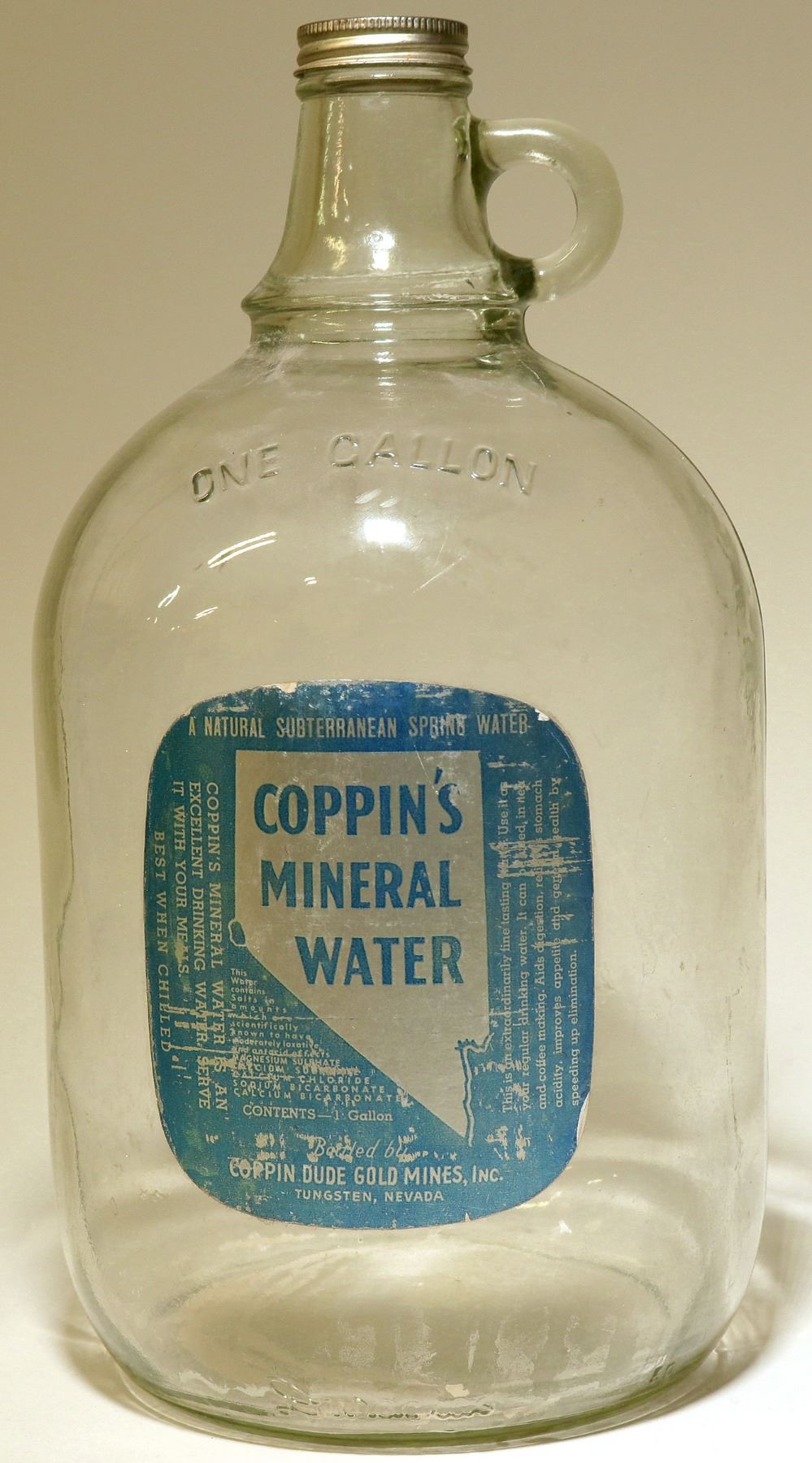 Well , here is a very strange and unusual item. Unembossed except for a paper label. A natural Subterranean Spring Water./Motif : Silver, Nevada shaped area that says : Coppin's / Mineral Water / Coppin Dude Gold Mines,Inc / Tungsten ,Nevada// This mineral water was produced in conjunction with the mines, and a dude ranch at that time. Nothing exists there now. 12" tall , one gallon size, clear in color and machine made. Perfect condition with base residue.Nice label, with all kinds of information. Unique, this is the only specimen known, at this time. (RH )Fred Holabird Collection