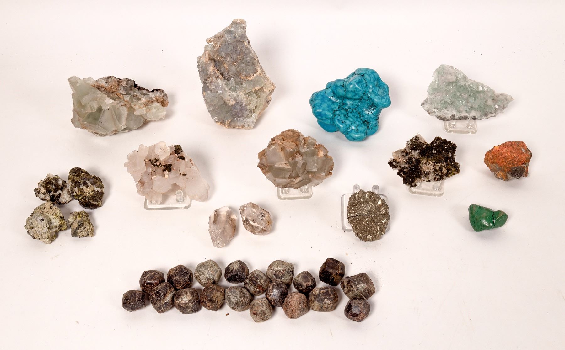 Pale green and a bit of pale purple fluorite cubes up to 3/8" across, 4.5 x 3.75 x 3"; polished amazonite, 1.5 x 1.25 x1"; orange realgar, 2 x 1.75 x 1.25"; four clusters of epidote crystals with quartz from 1.25" to 2" across, 185 gr; large polished specimen of chrysocola, which appears to have been sealed to prevent discoloration over time, 3.5 x 3 x 2.5"; rounded, radiating cluster of pyrite crystals2.25 x 1.75 x 0.75"; very pale blue-green fluorite cubes up to 1.25" across on a black crystalline matrix, 4.75 x 3 x 2.75"; 20 pyrope garnets from 1" to 1.25" across, 614 gr; two water-clear quartz crystals (almost Herkimers but points missing on one end) with inclusions, 2.25 x 1.25 x 1" and 1.75 x 1 x 1"; cluster of milky quartz crystals with flecks of dark-green epidote, 3.25 x 2.5 x 2"; fine crystals of dark-green epidote with tiny, clear quartz crystals on tan matrix, 3 x 2 x 1"; greyish fluorite crystals up to 1" across, 3.25 x 2.5 x 2"; clear pale blue fluorite crystals up to 1/2" across on white matrix, 4.25 x 2.5 x 1"; Localities unknown. China Chunlin Zhu Collection