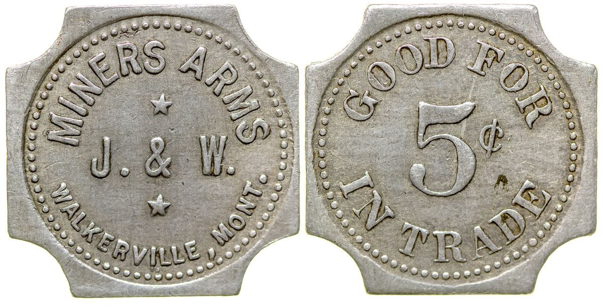 Miners Arms / J. & W. / Walkerville, Mont. // GF / 5c / IT. Square, w/ curved out corners, aluminum, 25mm. (Svoboda Collection) City: Walkerville State: Montana Date: HWAC# 35733