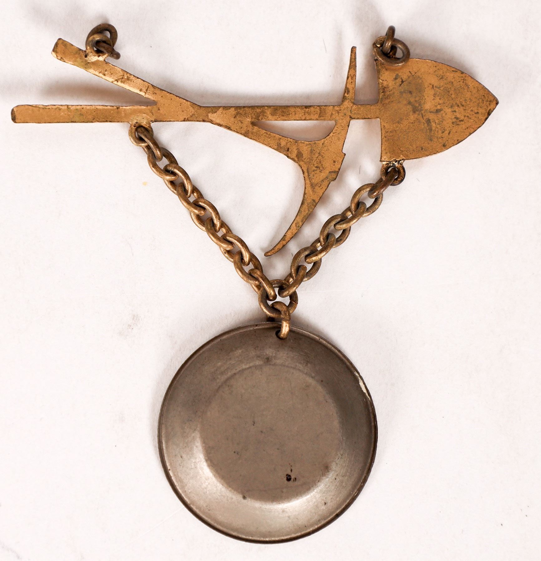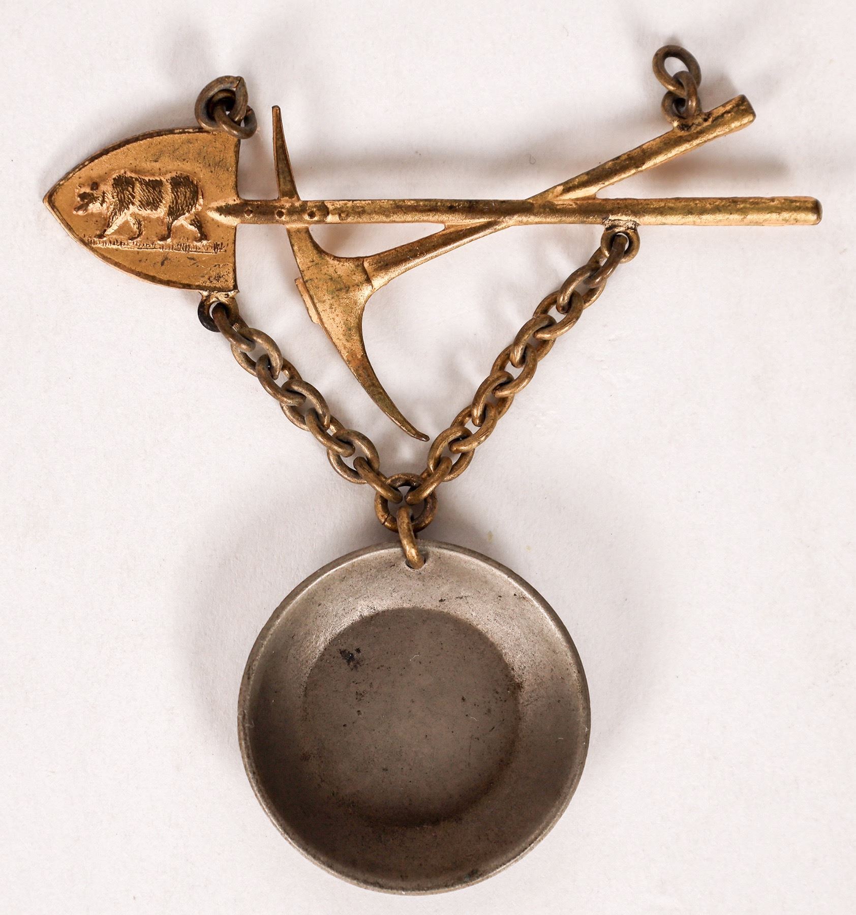 Pick, shovel and pan on a short chain, with a California grizzly bear on the shovel's face. 2 1/2 inches wide and two inches long. The top chain is broken. California
