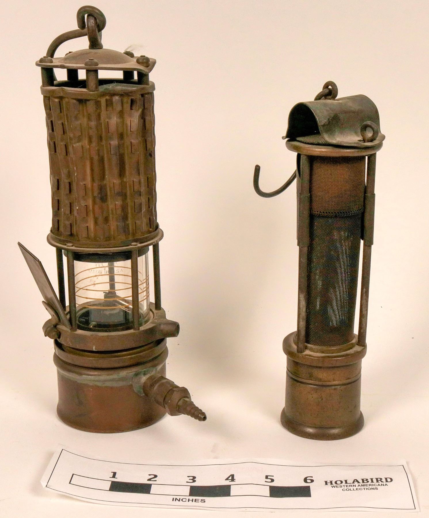 Unmarked bras Davey Lamp 9.5" tall, 2.5" diam; brass Wolf with reflector 11.5" tall, 3.5" diam.
