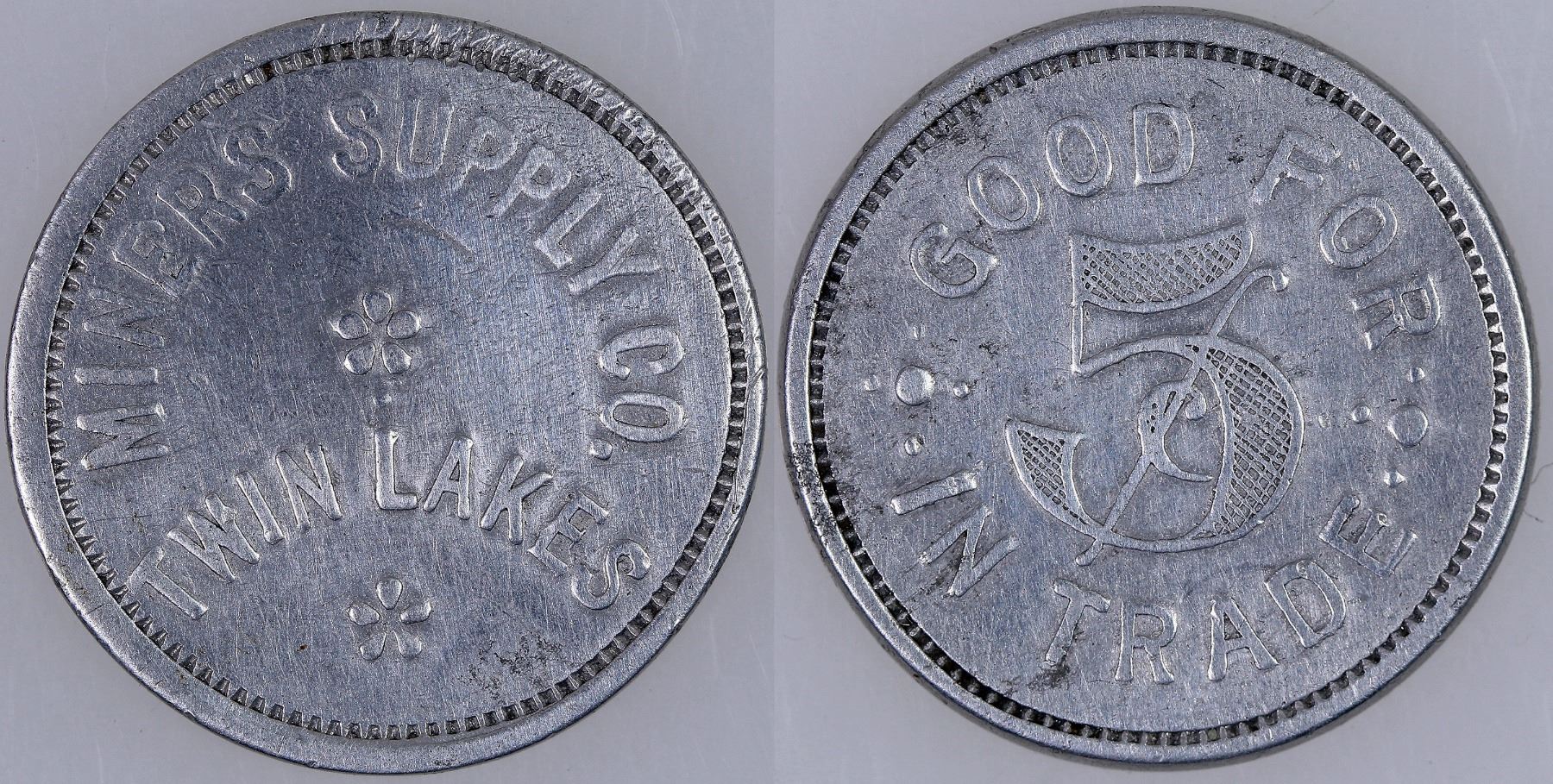 MINERS SUPPLY CO. / TWIN LAKES // GOOD FOR / 5¢ / IN TRADE; Al., rd., 23 mm.