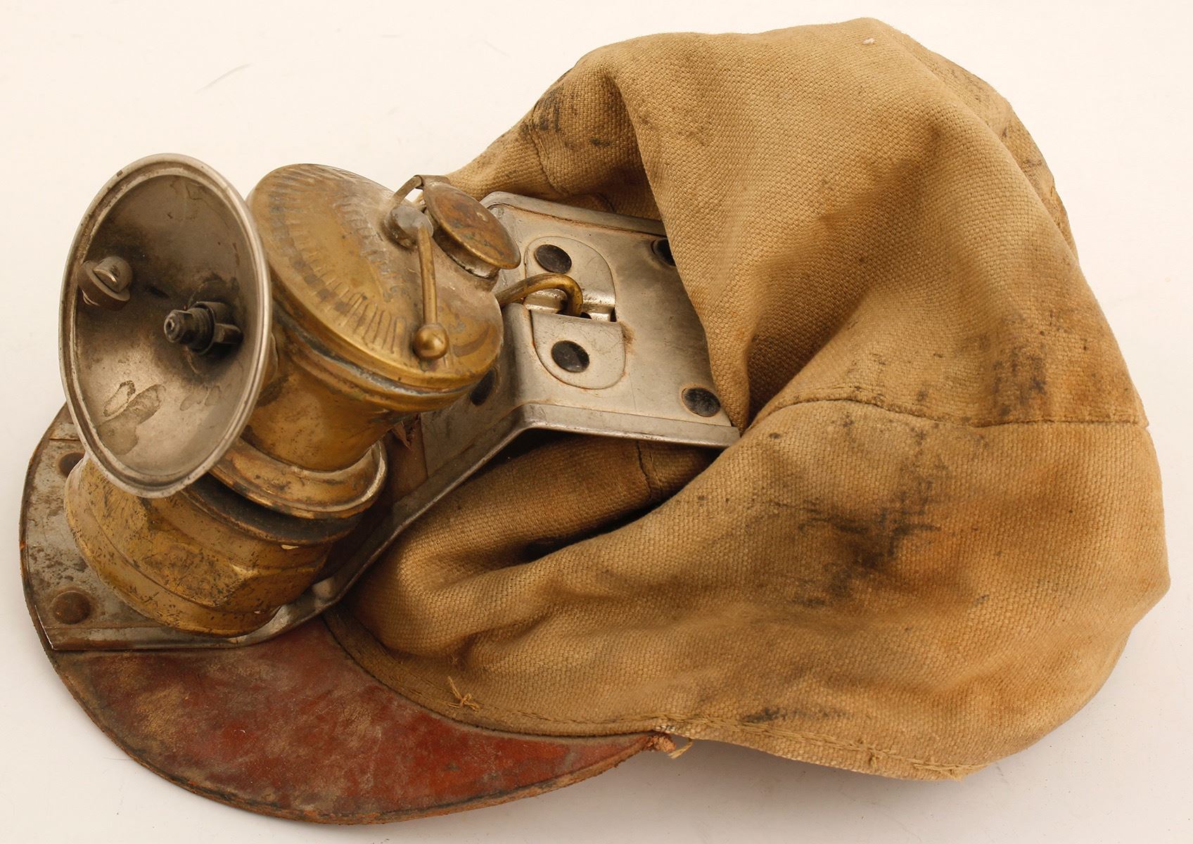 Original cloth miners had for underground mining with an auto light attached. Used average condition, from Hawthorne Nevada collection. HWAC# 61179 Date: Location: