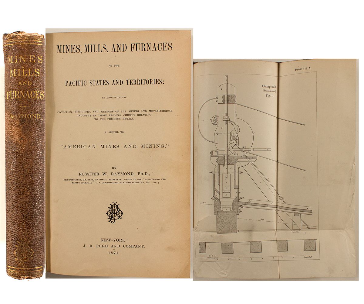 Raymond, Ross. Mines, Mills and Furnaces of the Pacific States and Territories.. 1871, 566pp, plus advertisements, triple indexed (mines, counties and districts, subjects). Ford & Co., New York. Part of the series Mining and Mineral resources West of the Rocky Mountains, written by Raymond as the US Mineral Commissioner. Privately published for his benefit. See story with next lot. I consider this series as mandatory for all mining history research (fh).City: County: State: Date: