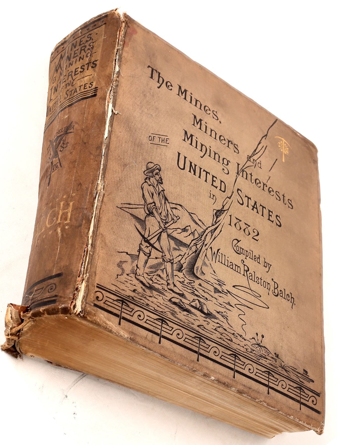 Mines miners and mining interests of the United States in 1882: compiled by William Ralston Balch 1882 - Publisher: Philadelphia- Mining Industrial Publishing Bureau, 1191 pp. A history of mining in the United States. Many illustrations, charts and tables. This book is one of the all-time classic mining references. It contains detailed information on companies, individual districts and metals in general. It is a large-scale reference work of approximately 8 x 11" size and 4 inches thick. Boards are unattached and the binding loose. This reference only comes up for auction about once every 10 years. Rarely available to collectors.