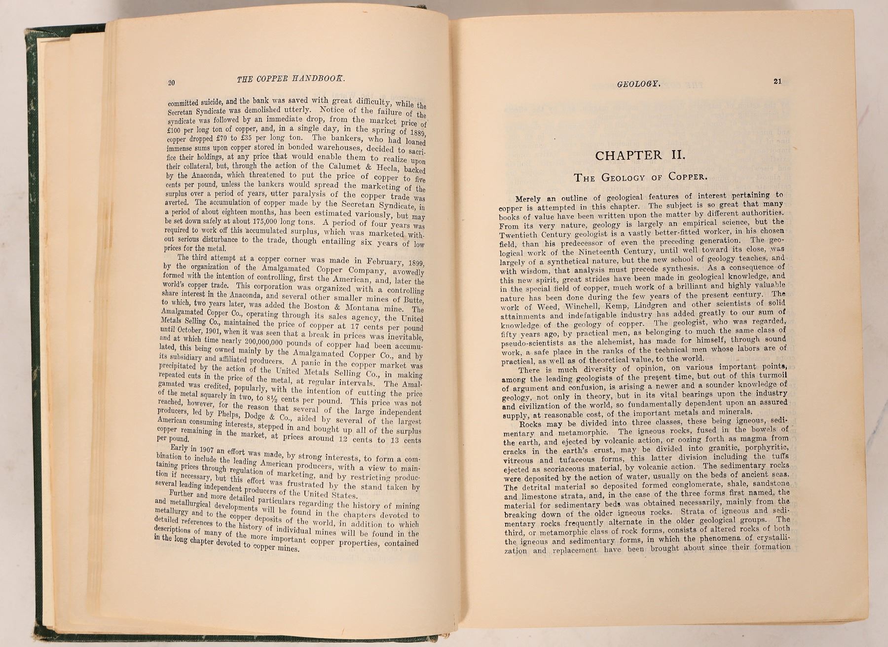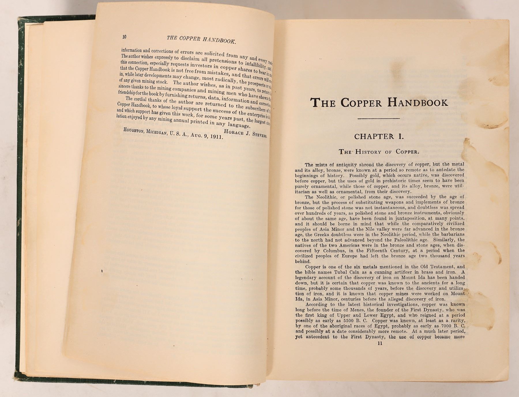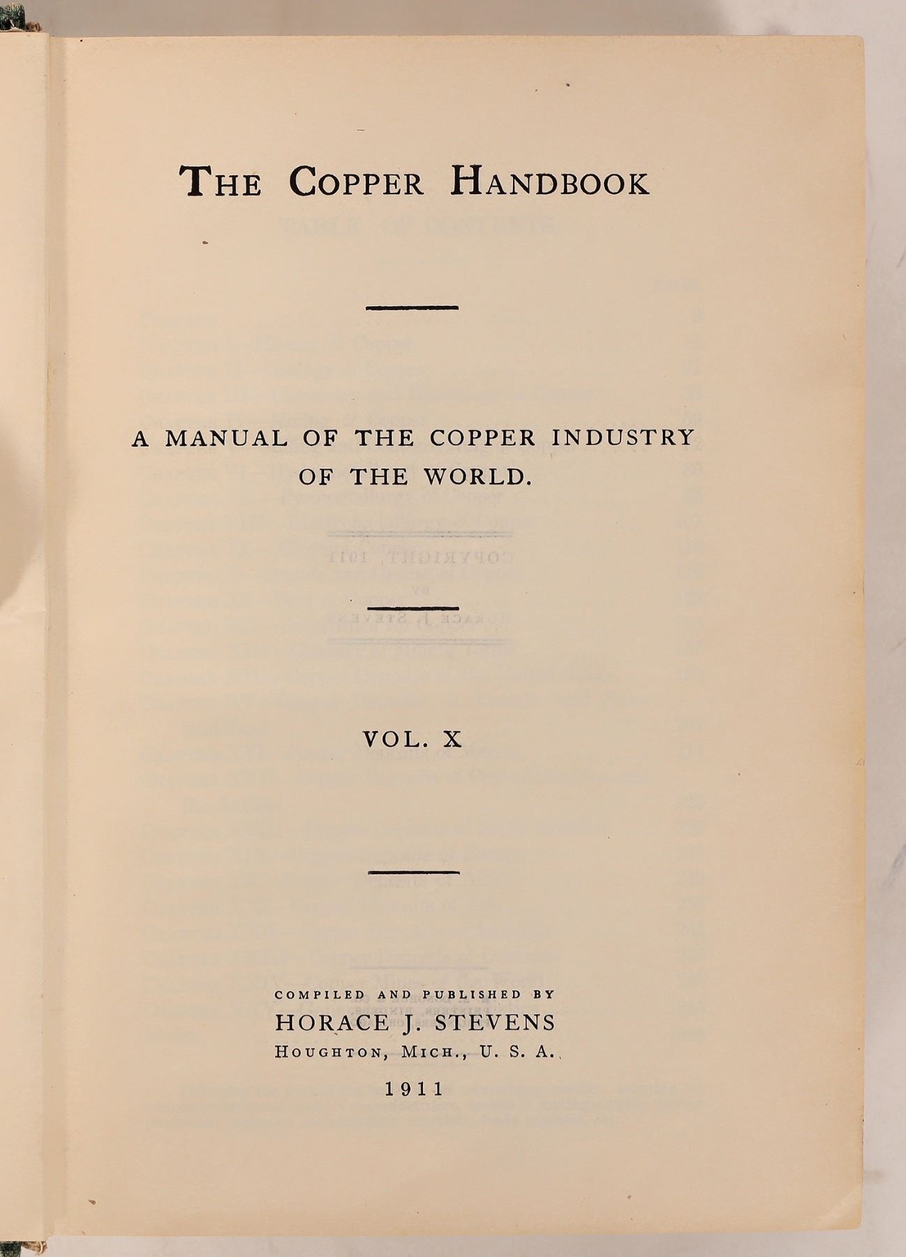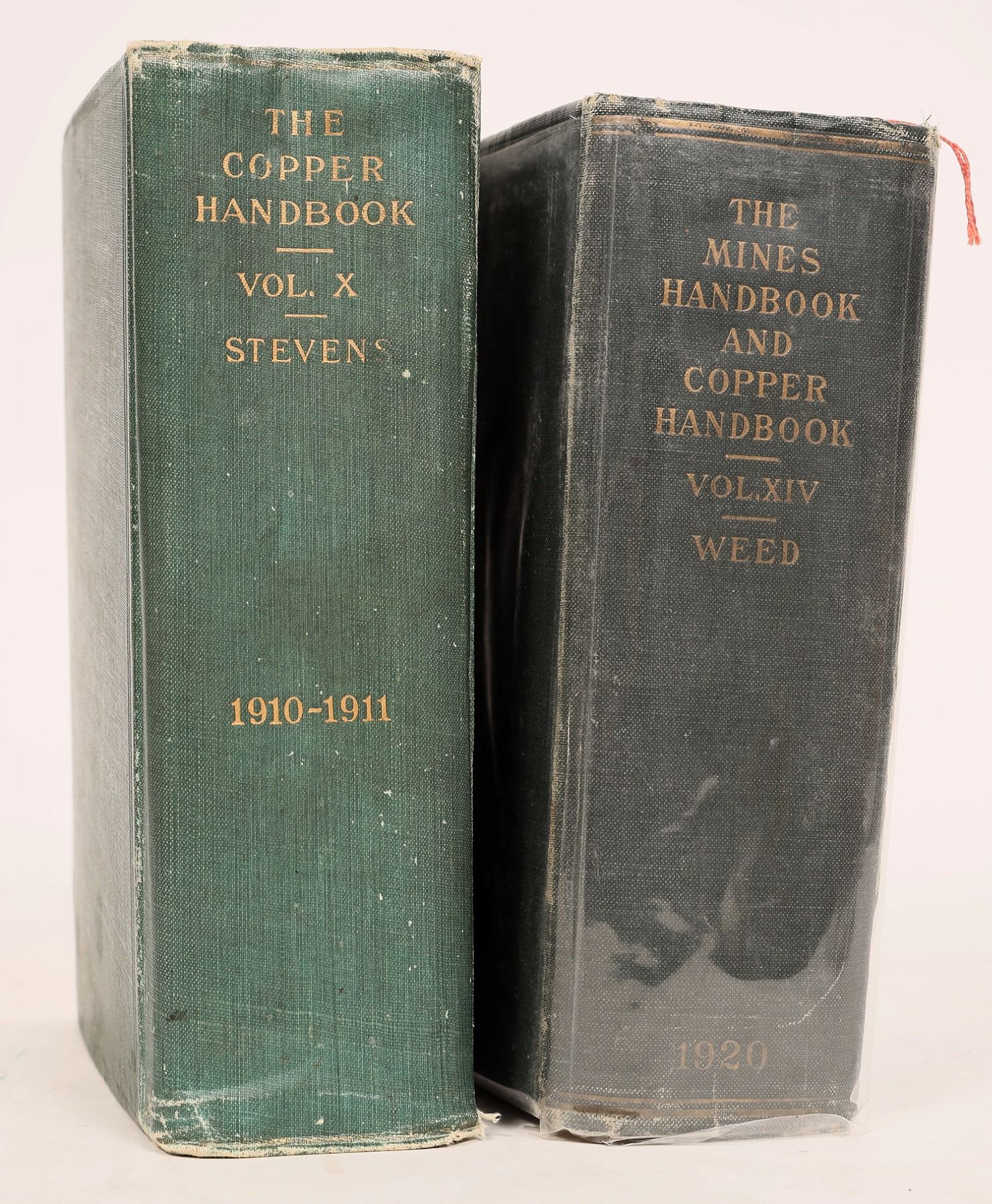 A pair of copper handbooks. Includes: "The Copper Handbook, a Manual of the Copper Industry of the World, Vol. X," Compiled and published by Horace J. Stevens, 1911, 9" x 6", 1901 pp., ad 37 pp., upper and lower spine wear, corner bumps, front hinge starting; and "The Mines Handbook, an enlargement of The Copper Handbook, A Manual of The Mining Industry of The World, Vol XIV, Supplementing Vols. I to XIII," Walter Harvey Weed, E.M., International Edition, 1920, 9" x 6", 1992 pp., bookplate for H. De C. Richards/Crocker Building/San Francisco, book description cut and pasted inside first page, plastic dust jacket, slight upper and lower spine wear, upper front corner bump, front hinge detaching.