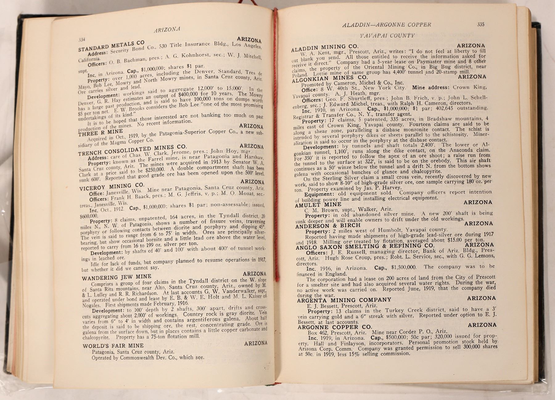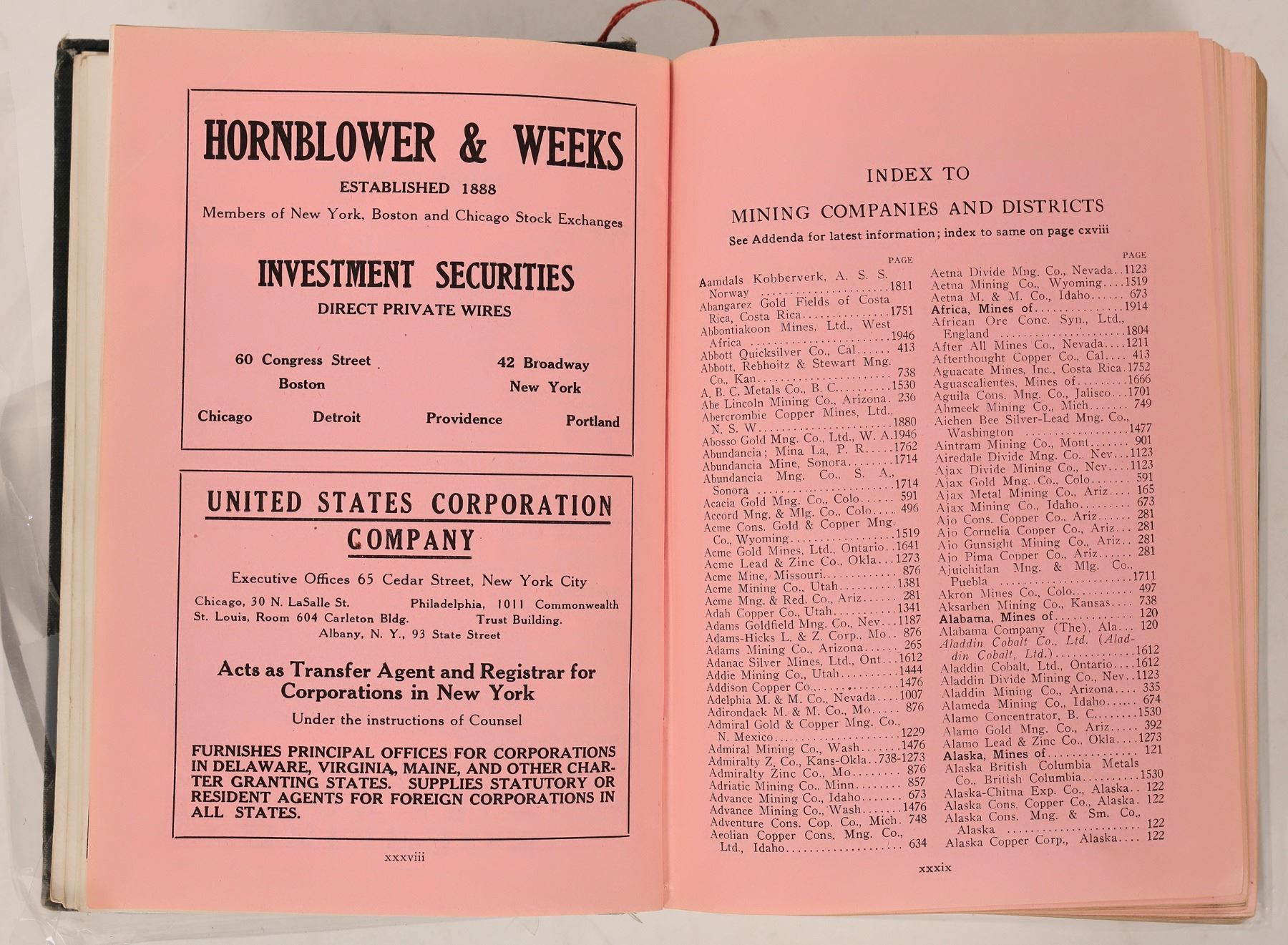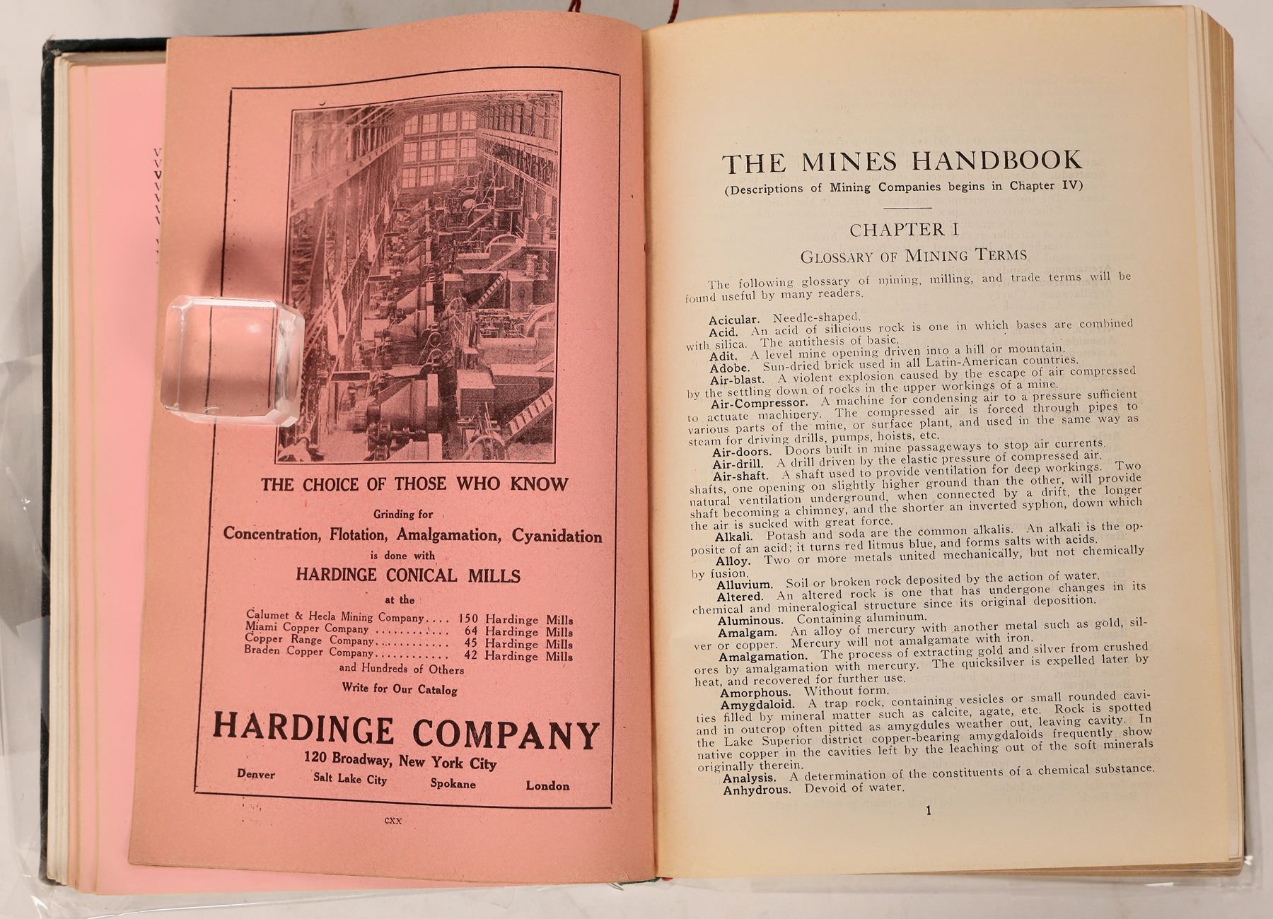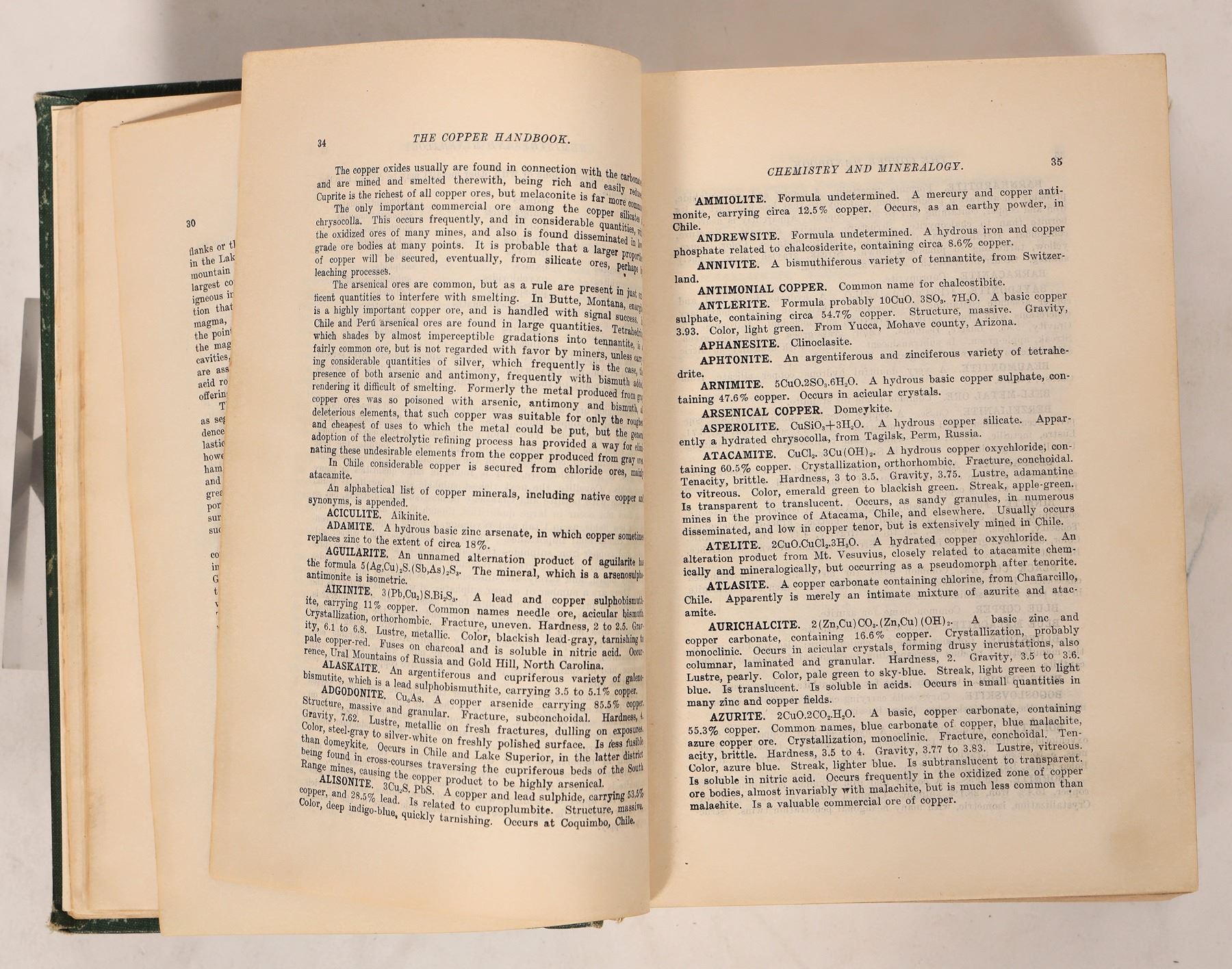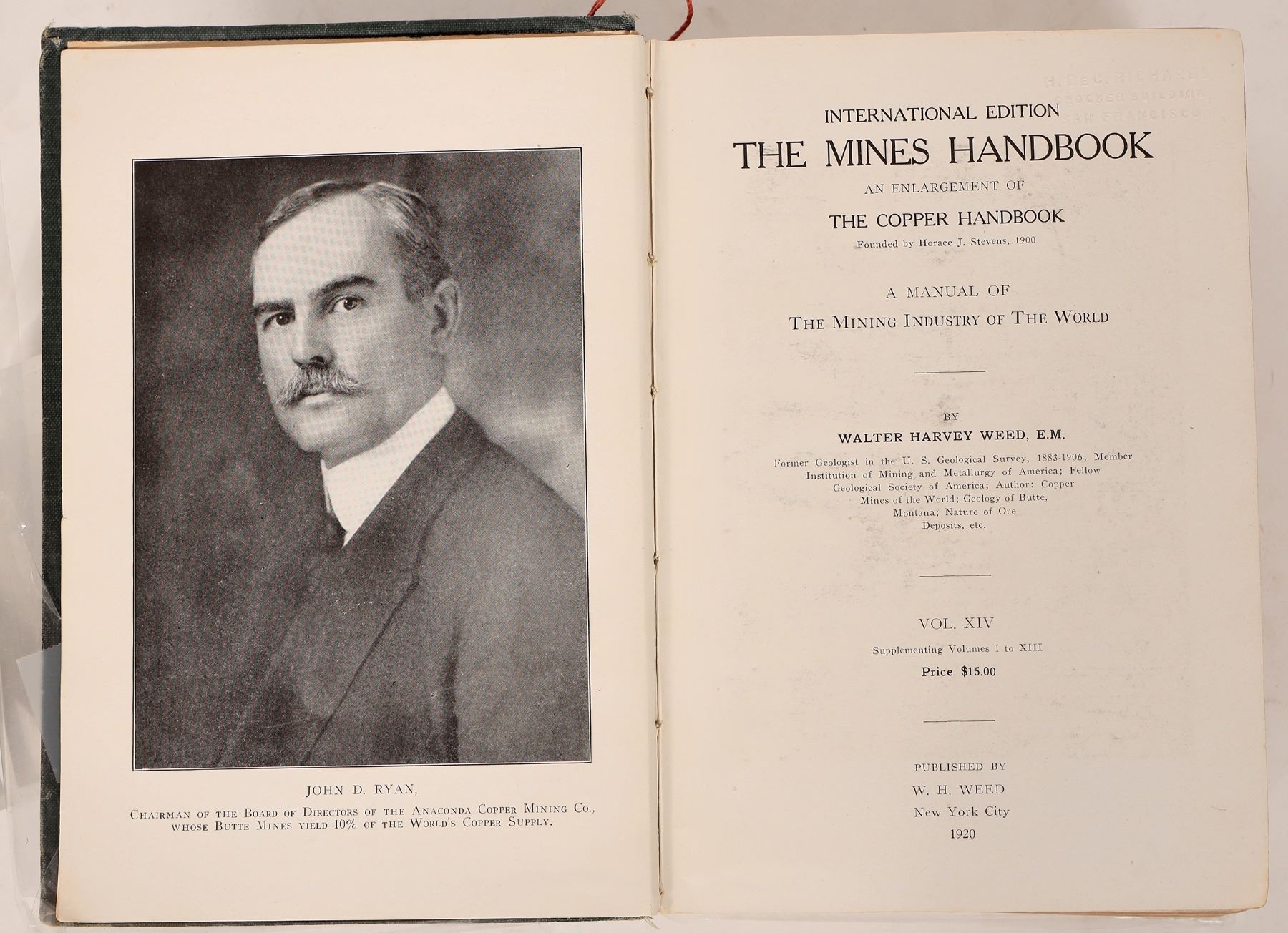 A pair of copper handbooks. Includes: "The Copper Handbook, a Manual of the Copper Industry of the World, Vol. X," Compiled and published by Horace J. Stevens, 1911, 9" x 6", 1901 pp., ad 37 pp., upper and lower spine wear, corner bumps, front hinge starting; and "The Mines Handbook, an enlargement of The Copper Handbook, A Manual of The Mining Industry of The World, Vol XIV, Supplementing Vols. I to XIII," Walter Harvey Weed, E.M., International Edition, 1920, 9" x 6", 1992 pp., bookplate for H. De C. Richards/Crocker Building/San Francisco, book description cut and pasted inside first page, plastic dust jacket, slight upper and lower spine wear, upper front corner bump, front hinge detaching.