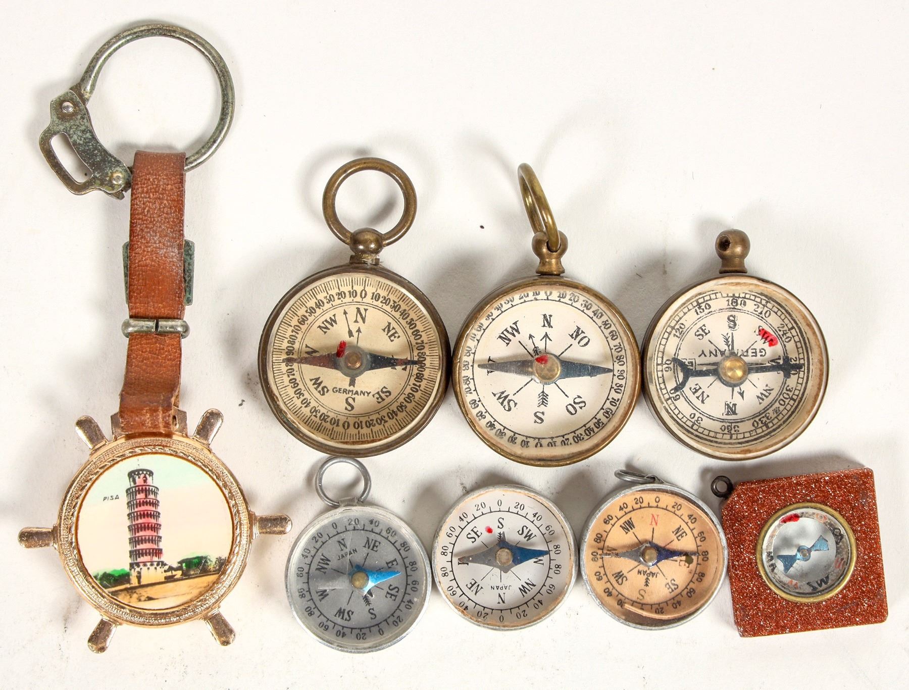 This lot has eight mini-compasses with one looking more like casual jewelry c. 1920's. Best of all they all still work. One compass has a ship's wheel, leather strap and carabiner release. The largest one is about 1 in. in diameter. It may have been fashionable to discreetly wear a compass to show your explorer attitude. Please see photo for details.