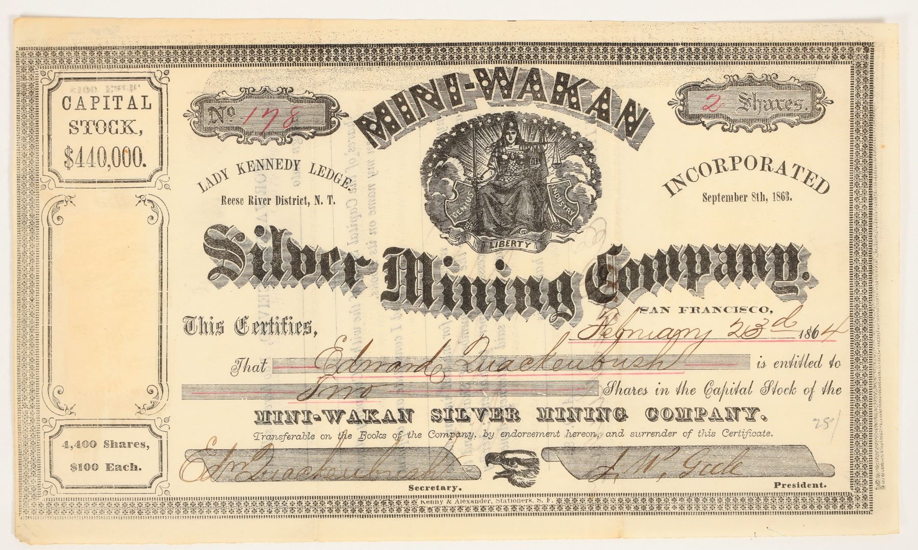Rare; we've not offered this before! "Lady Kennedy Ledge, Reese River, N.T." printed to the left of a striking Lady Liberty vignette. Inc. Sept. 1863. No. 178, issued for 2 shares to secretary Edward Quakenbush on February 23rd, 1864 in SF. Also signed by president LW Gule. Not cancelled. Kenny & Alexander, Stationers, SF. Folds, light toning. Mini-Wakan translates to spirit or sacred water in Dakota. We were not able to find any more information about this mine.