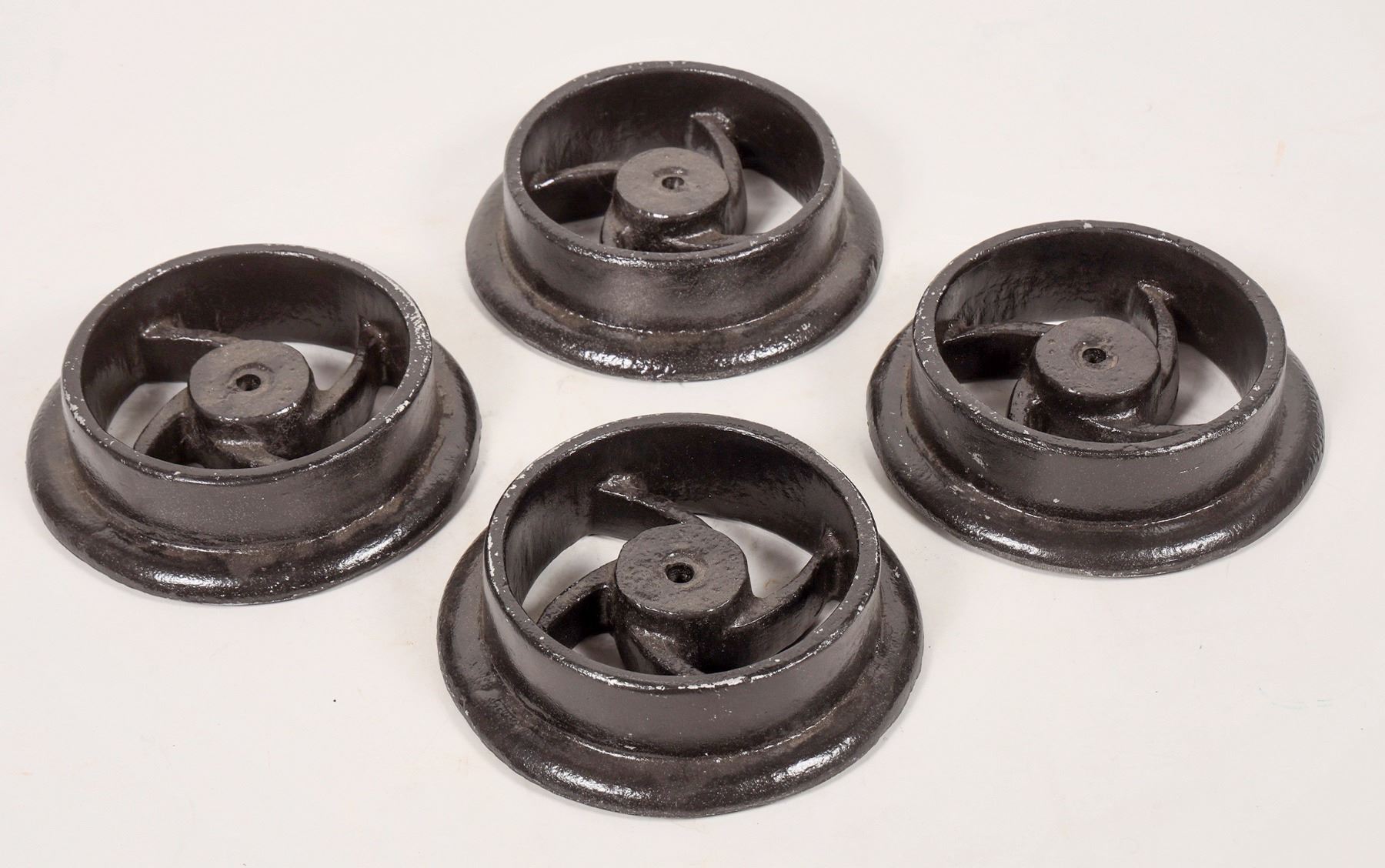 4 miniature minecar wheels, 4 curved spokes. Modern made, probably for a small ore car model. Made of white metal painted black. Diameter is 7 1/4", and the thickness of each wheel is 1 7/8".