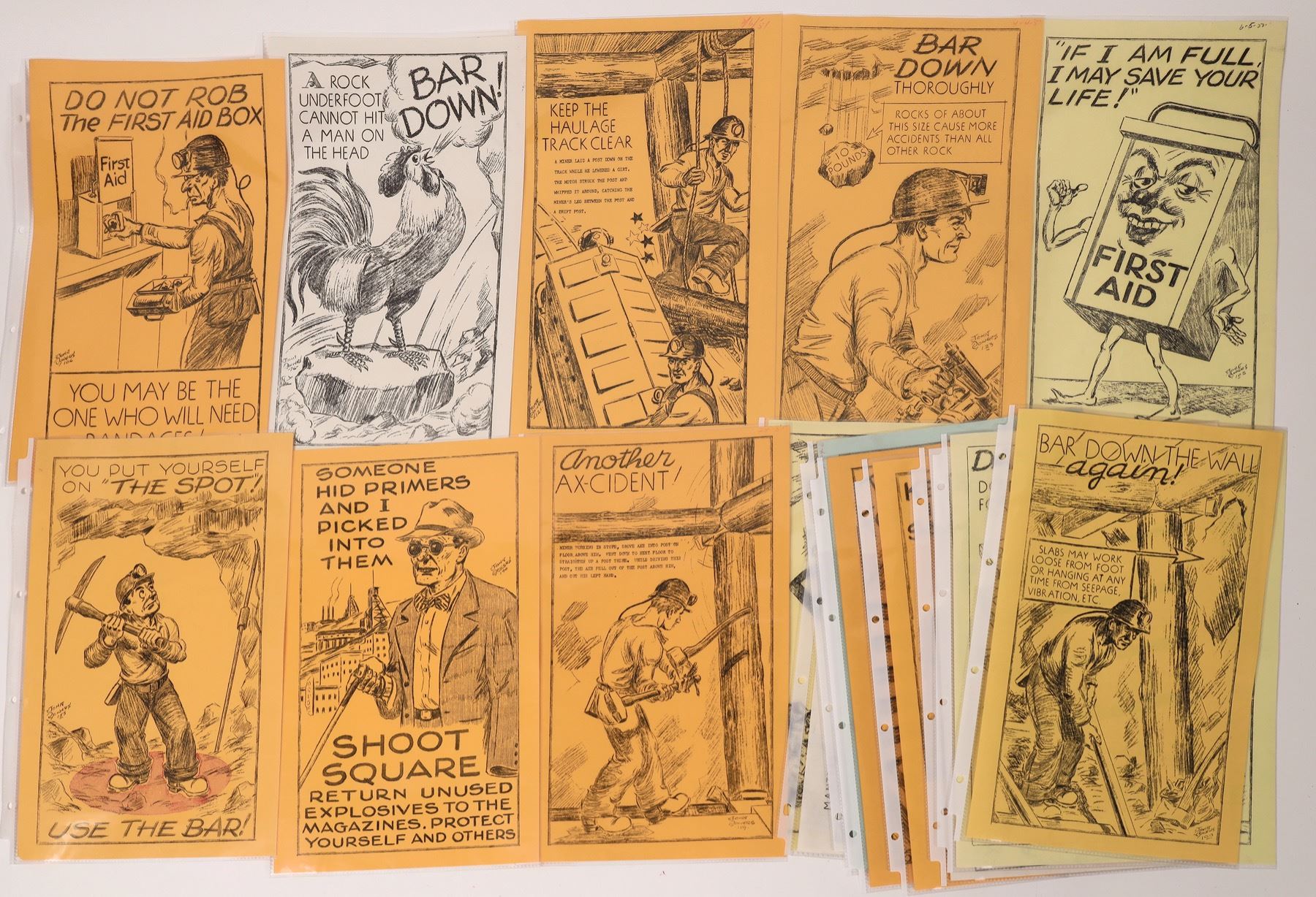 About 17 approx. 14x8.5" mining accident safety posters. Bar down, first aid, first aid, Keep it Safe etc.