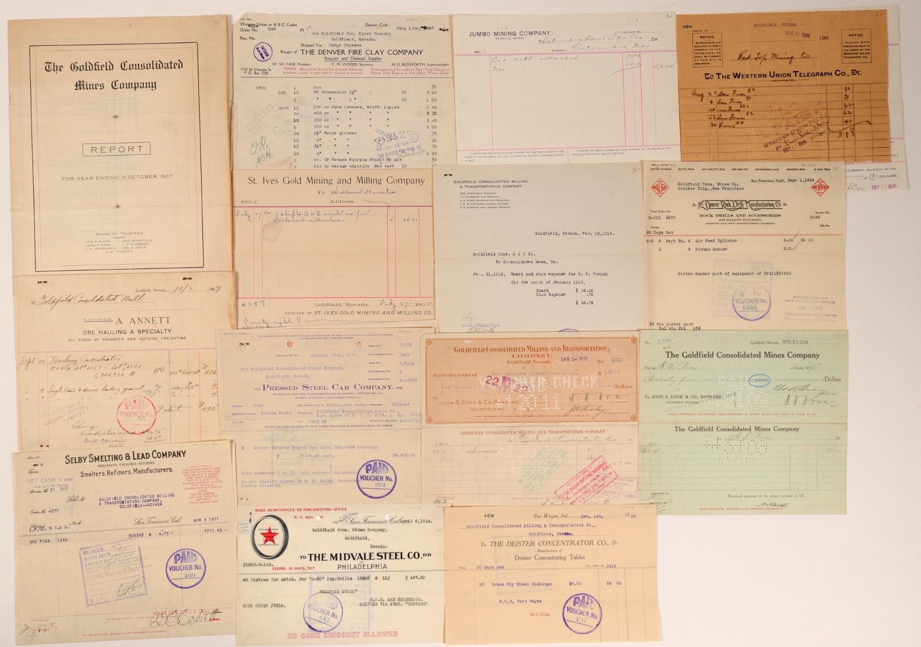 Wow ! Here is some great bill heads ! Items # 1- #10 of 14: Goldfield Consolidated Milling & Transportation Co to: Midvale Steel ( With A Red Star) (1914), Denver Rock Drill ( 1916), Consolidated Mess ( 1916), Selby Smelting & Lead Co. ( 1911), The Deister Concentrator Co ( 1910), A. Annett Ore Hauling( 1909), Pressed Steel Car Company ( 1911), John S. Cook & Co. Bankers( 1909 ), The Diester Concentrator Co. ( 1911), & The Denver Fire Clay Co., ( 1908). Item # 11 of 14: Jumbo Mining Company ( 1906). Item # 12 of # 14 : Red Top Mining ( 1906). Item # 13 of 14: St. Ives Mining & Milling Company. Item # 14 of 14: The Goldfield Consolidated Mines Company Report, 24 pages ( 1907), from many mines !!. Really fine condition on documents. Great collection...Come for the Gold.( RH). Goldfield Nevada 1905-1916