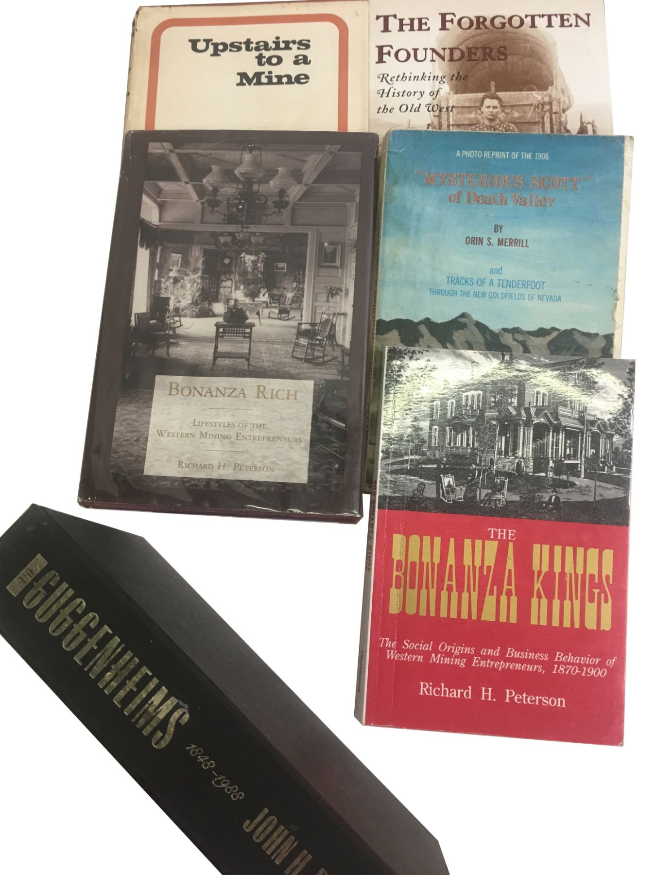 Mostly hardcovers. Forgotten Founders by Udall, Upstairs to a Mine, Mysterious Scott of Death Valley by Merrill, Bonanza Rich by Peterson, The Guggenheims by Davis, Bonanza Kings by Peterson State: USA City: Date: