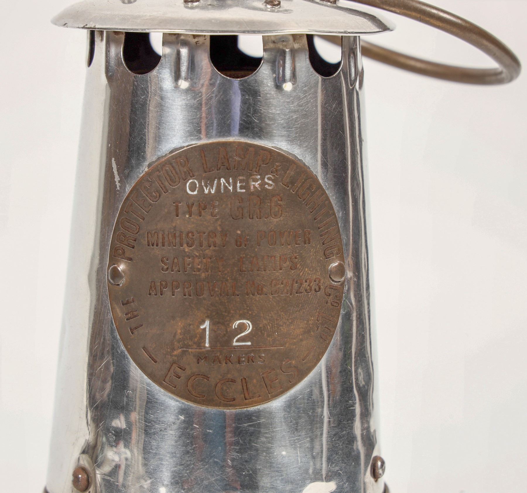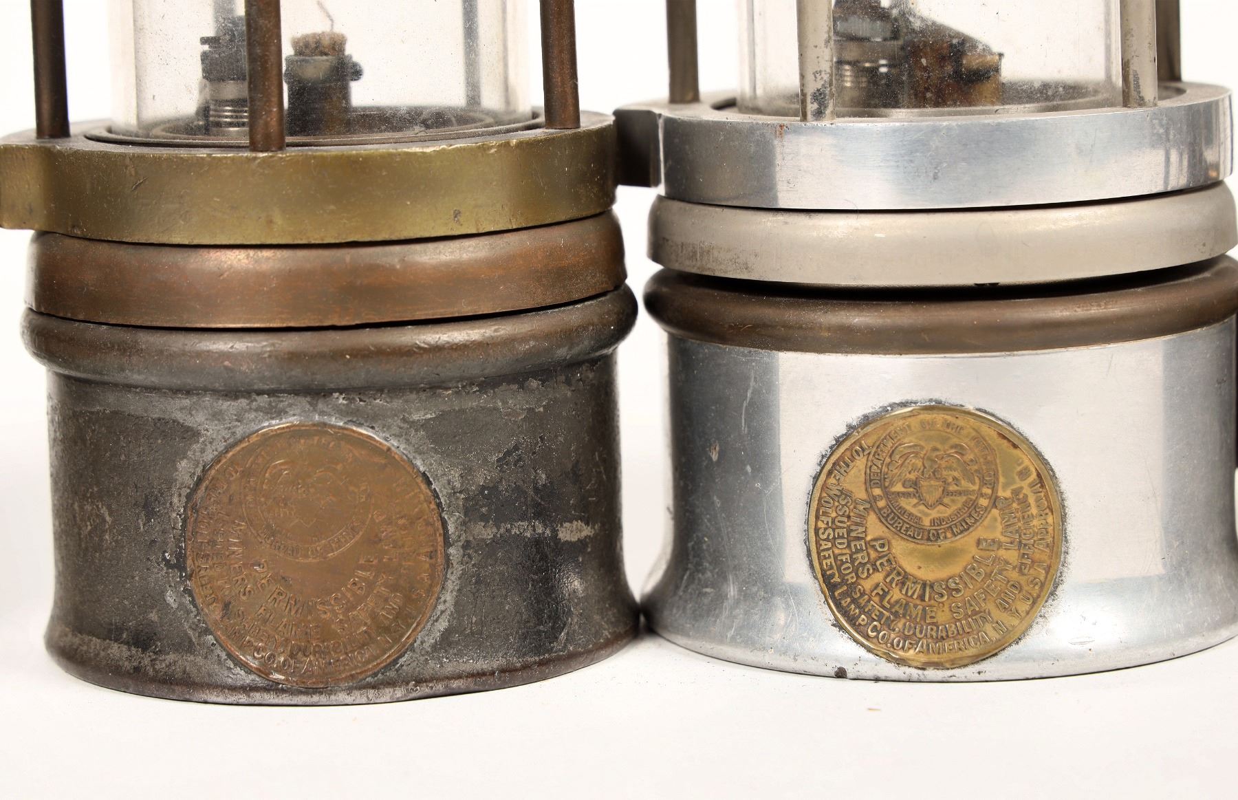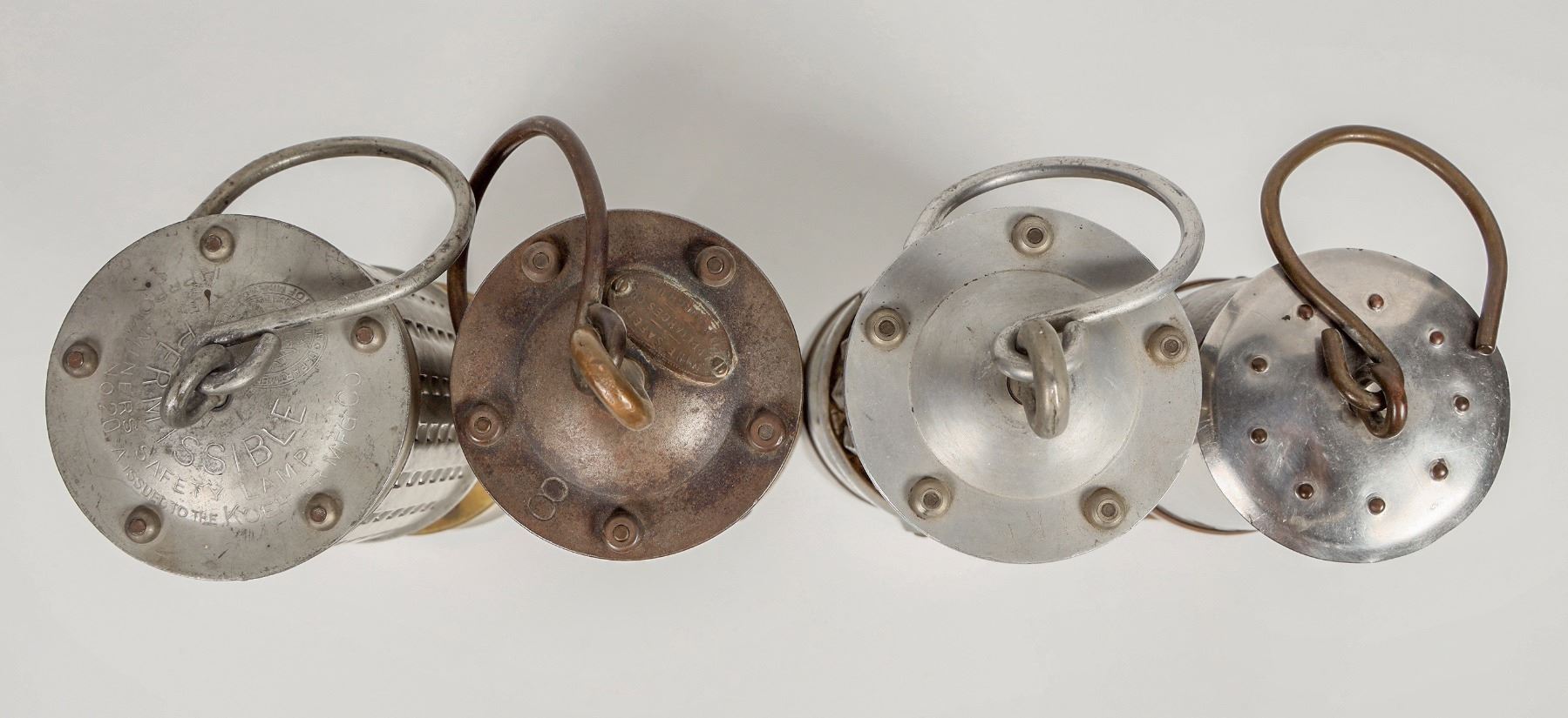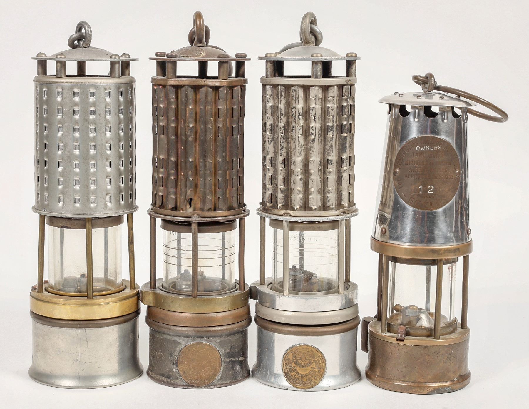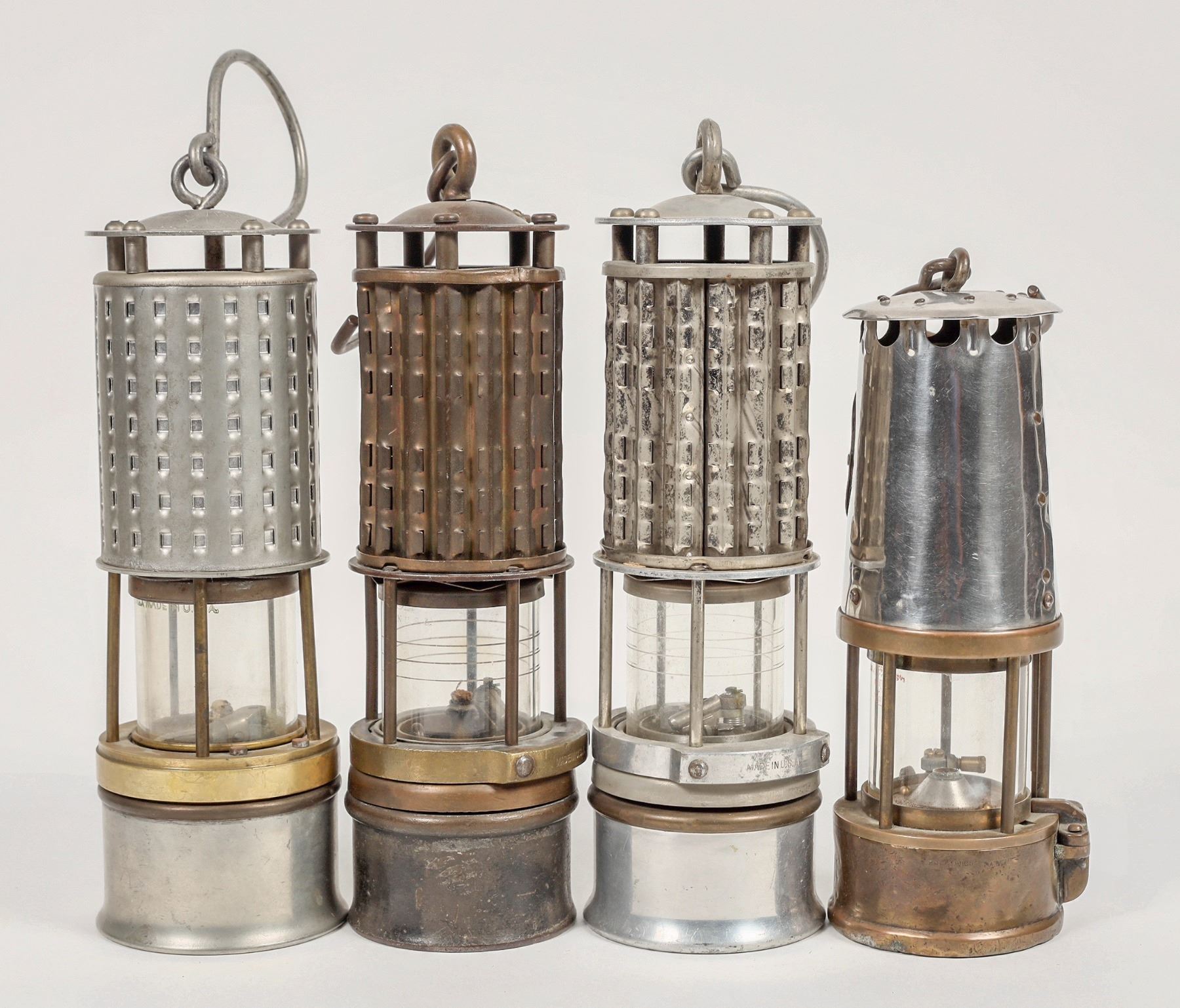 Terrific Lot of (4) Mining Safety Lamps, from various manufacturers, all approved by the Bureau of Mines. Lamp #1 is a Koehler model, steel construction with brass connecting ring at center. Lamp #2 is a Wolf Safety Model, brass construction with steel base. Lamp #3 is another Wolf Safety model, this one constructed of aluminum with a brass safety approval seal. Lamp #4 is a Protector model, from the Protector Lamp and Light Co. of Eccles UK. It is constructed of brass and Nickle-plated brass. All four lamps are in excellent condition. They measure between 10" and 11" tall, approx. 3" in diameter. All have hanging hooks at their tops. All are heavy screw or riveted construction to withstand the rigors of mining. Beautiful pieces of mining history!