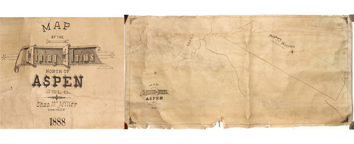 Aspen. Map of the Mining Claims North of Aspen" by Chas. W. Miller, 1888. Litho of GW and CB Colton, New York. canvas backed, as original. 58" x 30" Tears along edges and along center fold, as might be expected. 1" = 600' Map of all surveyed claims. Includes inset of Porphyry Mountain mining claims. Shows W. C. E. Koch's Ranch along Hunter Creek, a tributary of Roaring Fork River. Very rare map of the early surveyed mining claims from Aspen north.City: AspenCounty: PitkinState: CODate: