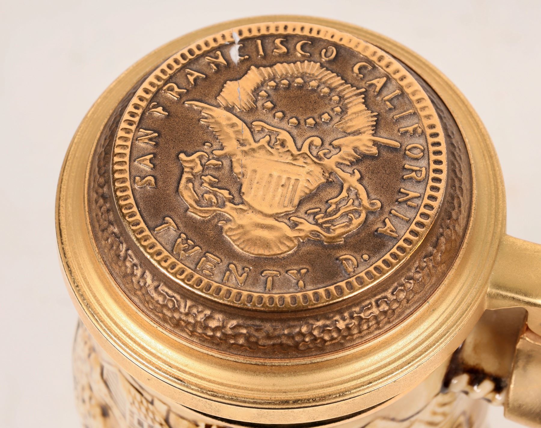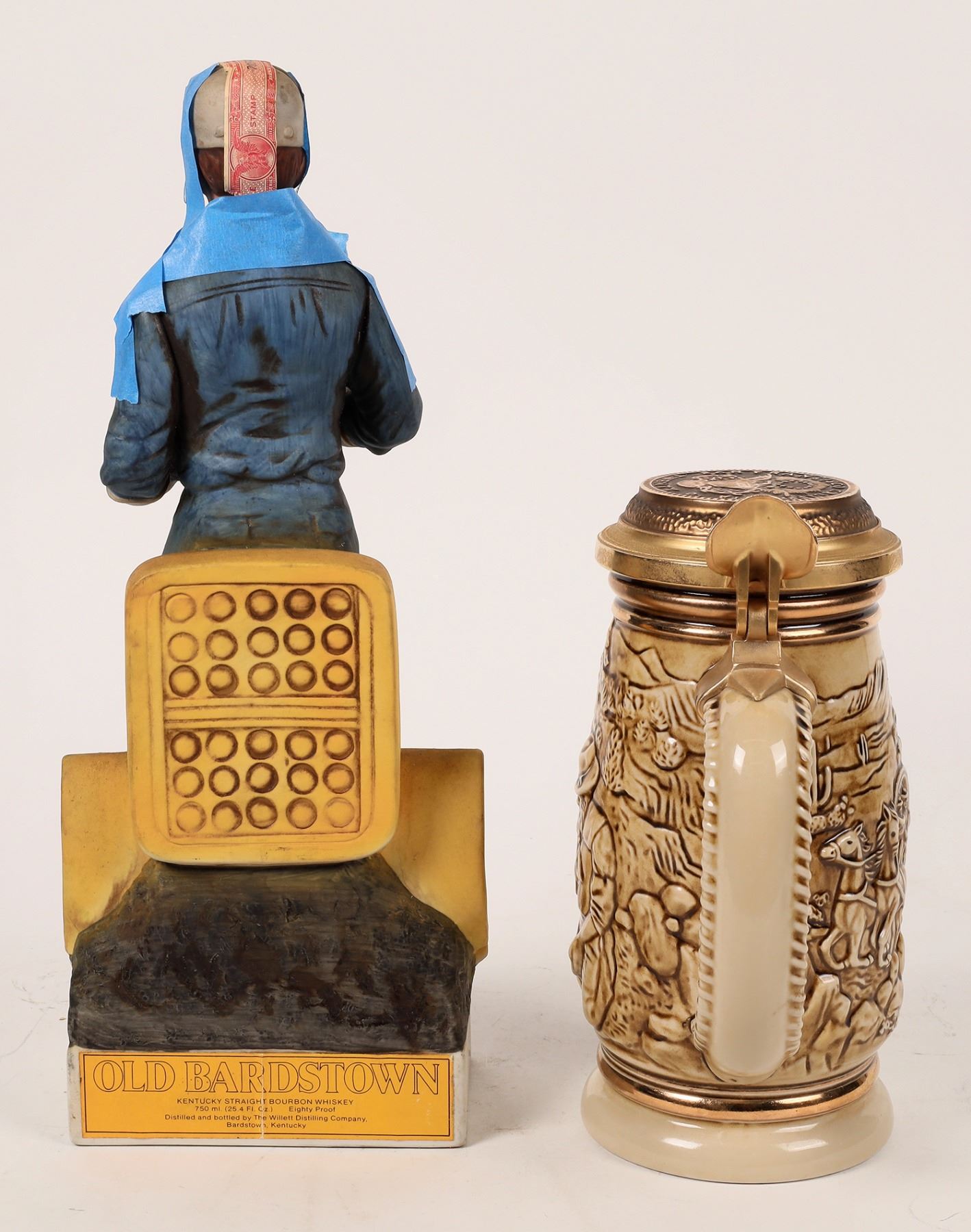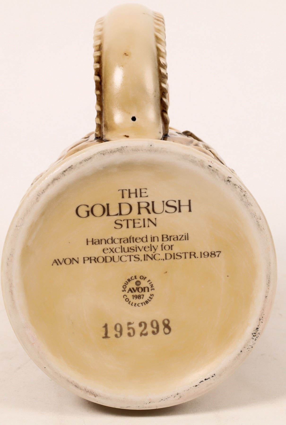 Old Bardstown Bourbon Surface Miner decanter without contents, 13" tall. Avon 1987 The Gold Rush Stein with panning miner and Western street scene, 8.75" tall.