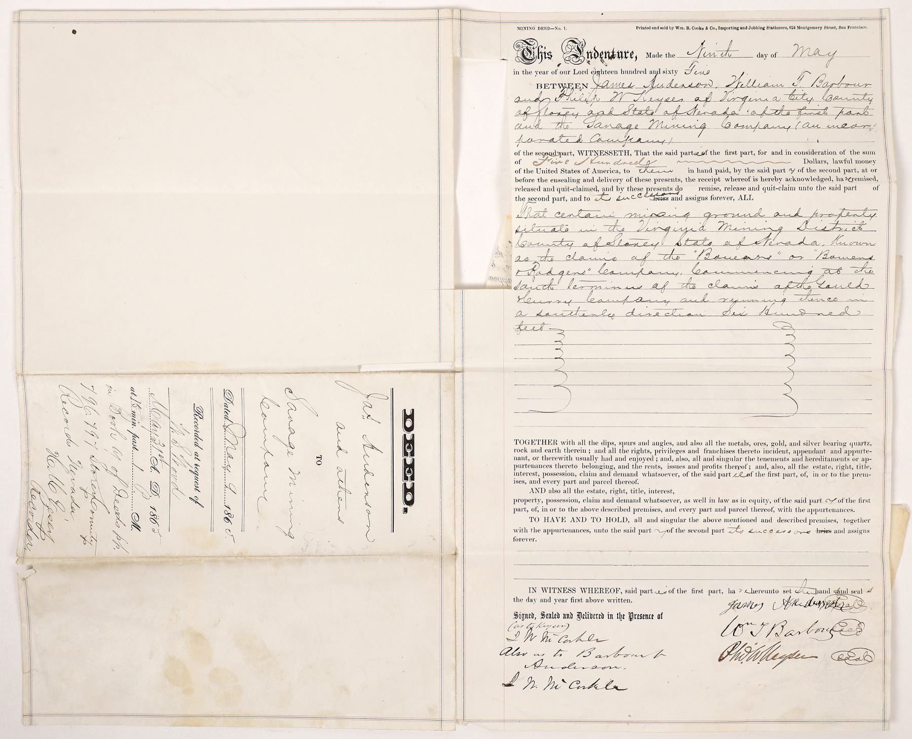 Rare mining deed between James Anderson, William T. Barboun, Philip W. Keyes (who purchased the claim from Sandy Bowers and James Rodgers) and the Savage Mining Co. for the 600 foot claims known as Bowers and Rogers for $500. Stamps cut out. 8.5 x14" Lemuel Sanford (Sandy) Bowers was one of the townÌs early arrivals in 1857 first running a boarding house further south in Gold Canyon for the placer miners. He purchased a number of claims but the most profitable was a ten foot strip being part of the Little Gold Hill Mines. On August 9, 1859, Eilley Orrum and Sandy Bowers joined their mining claims and married in Gold Hill. One of the richest mines in bothSilver and Gold, the couple built a mansion in Washoe, now a museum. Virginia City Nevada 1865