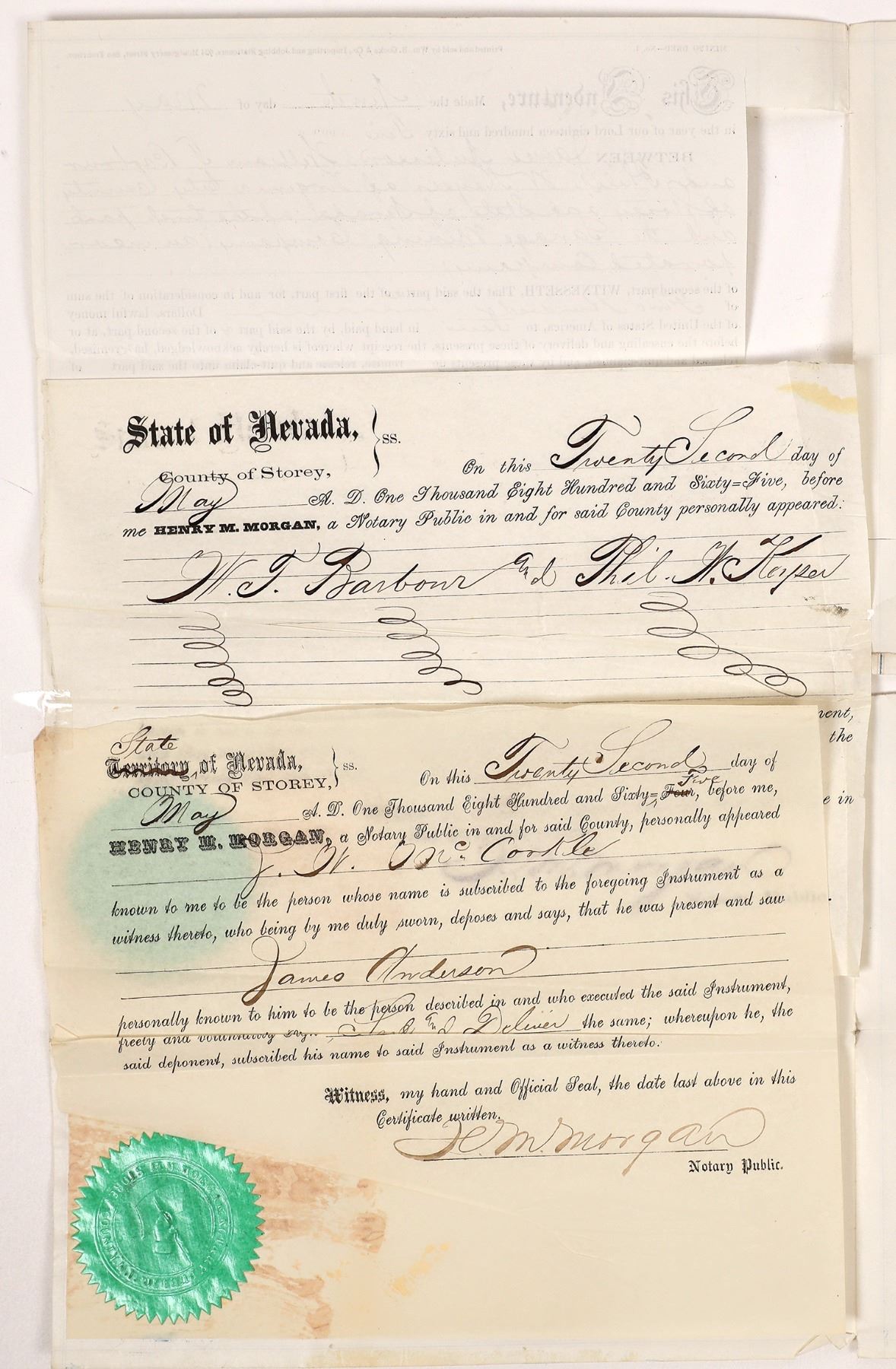Rare mining deed between James Anderson, William T. Barboun, Philip W. Keyes (who purchased the claim from Sandy Bowers and James Rodgers) and the Savage Mining Co. for the 600 foot claims known as Bowers and Rogers for $500. Stamps cut out. 8.5 x14" Lemuel Sanford (Sandy) Bowers was one of the townís early arrivals in 1857 first running a boarding house further south in Gold Canyon for the placer miners. He purchased a number of claims but the most profitable was a ten foot strip being part of the Little Gold Hill Mines. On August 9, 1859, Eilley Orrum and Sandy Bowers joined their mining claims and married in Gold Hill. One of the richest mines in bothSilver and Gold, the couple built a mansion in Washoe, now a museum. Virginia City Nevada Franklin Collection