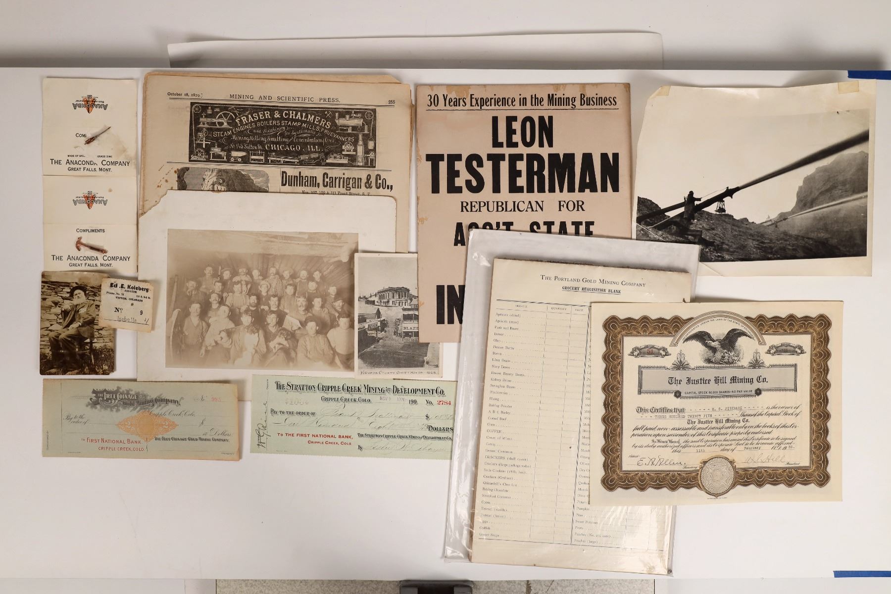 2 Anaconda tool cards, 2 Cripple Creek checks. Mine inspector candidate sign. 8x10" hydraulic monitor photo. .5" pad of Portland Gold Mining grocery requisition blank forms c. 1920's. Miner group photo with guns! 6x8". Mining and Scientific Press 1879 etc.