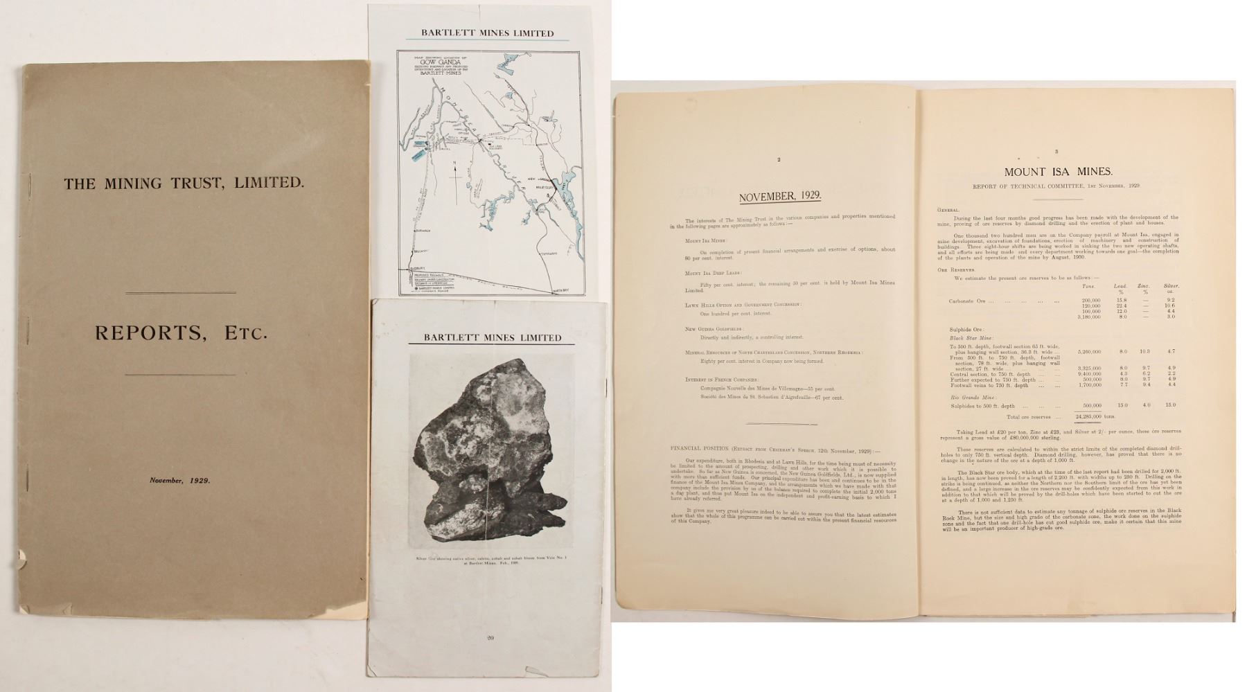 1. The Mining Trust, Limited November, 1929 Queensland. Report consisting of 15 pages of holdings in Mt. Isa in Australia, Lawn Hills Concession, Queensland, New Guinea, Northern Rhodesia, France. Back of report has maps with locations of boreholes, summary of drilling results. Out side cover shows some wear, but internal pages and maps are in good condition. The history can be found in the book "Company Towns: Corporate Order and Community" by Neil White. 2.Bartlett Mines, LTD GOW Ganda. Booklet of pictures of property July, 1909. Booklet has 16 pictures and is in good shape. Included is map of the GOW GANDA area. All are in Plastic sleeves for protection.