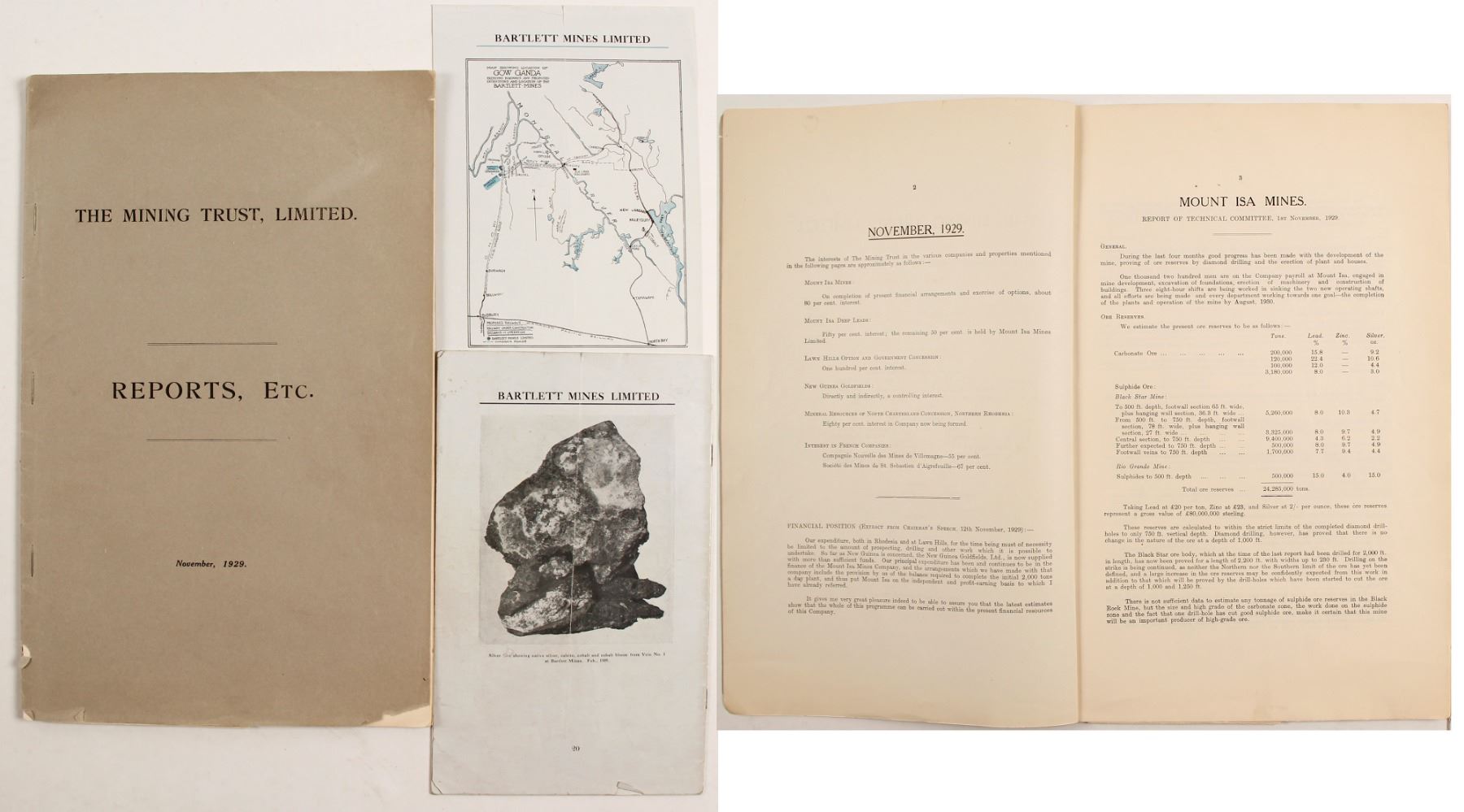 1. The Mining Trust, Limited November, 1929 Queensland. Report consisting of 15 pages of holdings in Mt. Isa in Australia, Lawn Hills Concession, Queensland, New Guinea, Northern Rhodesia, France. Back of report has maps with locations of boreholes, summary of drilling results. Out side cover shows some wear, but internal pages and maps are in good condition. The history can be found in the book "Company Towns: Corporate Order and Community" by Neil White.