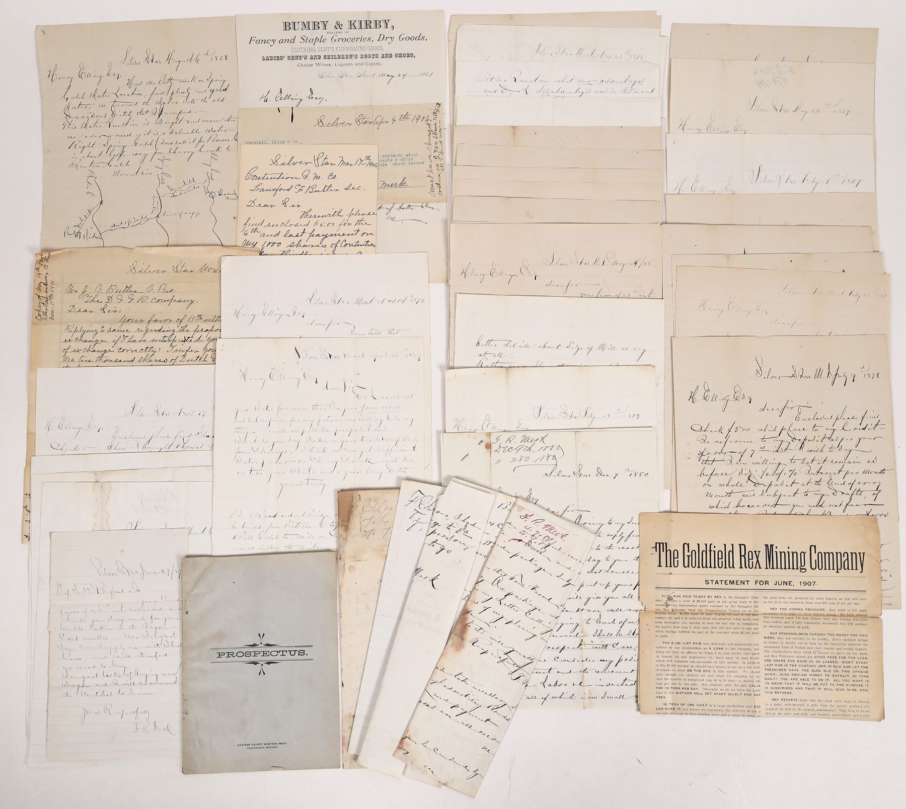 About 30 pieces of mining ephemera c. 1878-1911, mostly to Henry Elling. Goldfield Rex, Sierra Nevada Mines, Spring Gulch with hand drawn map, several letters from F R Merk, etc. Delaware and Maryland Patents prospectus mentioning F R Merk as the owner, undated.