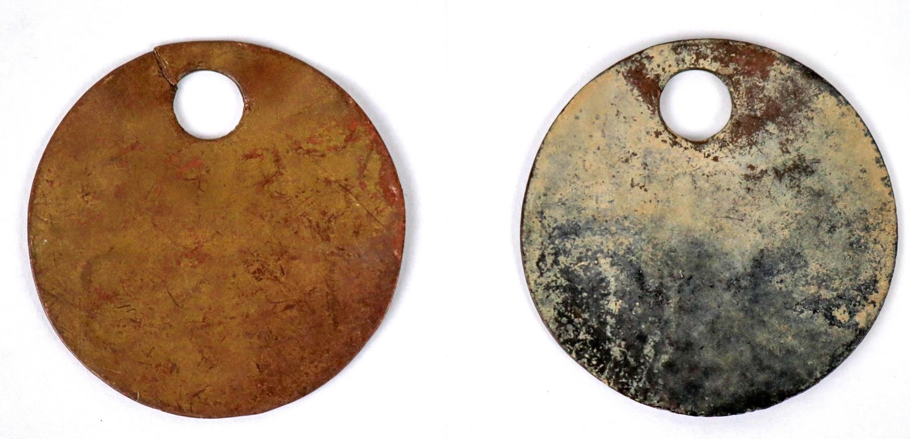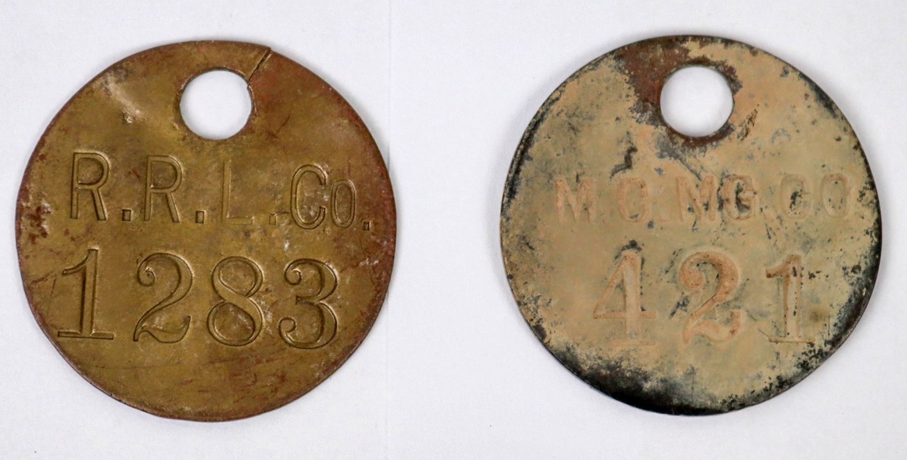 MC MG co & RRL co mining tags found in Nevada. Tags measure 1.4" across, with .25" keychain holes. Please inspect photo.