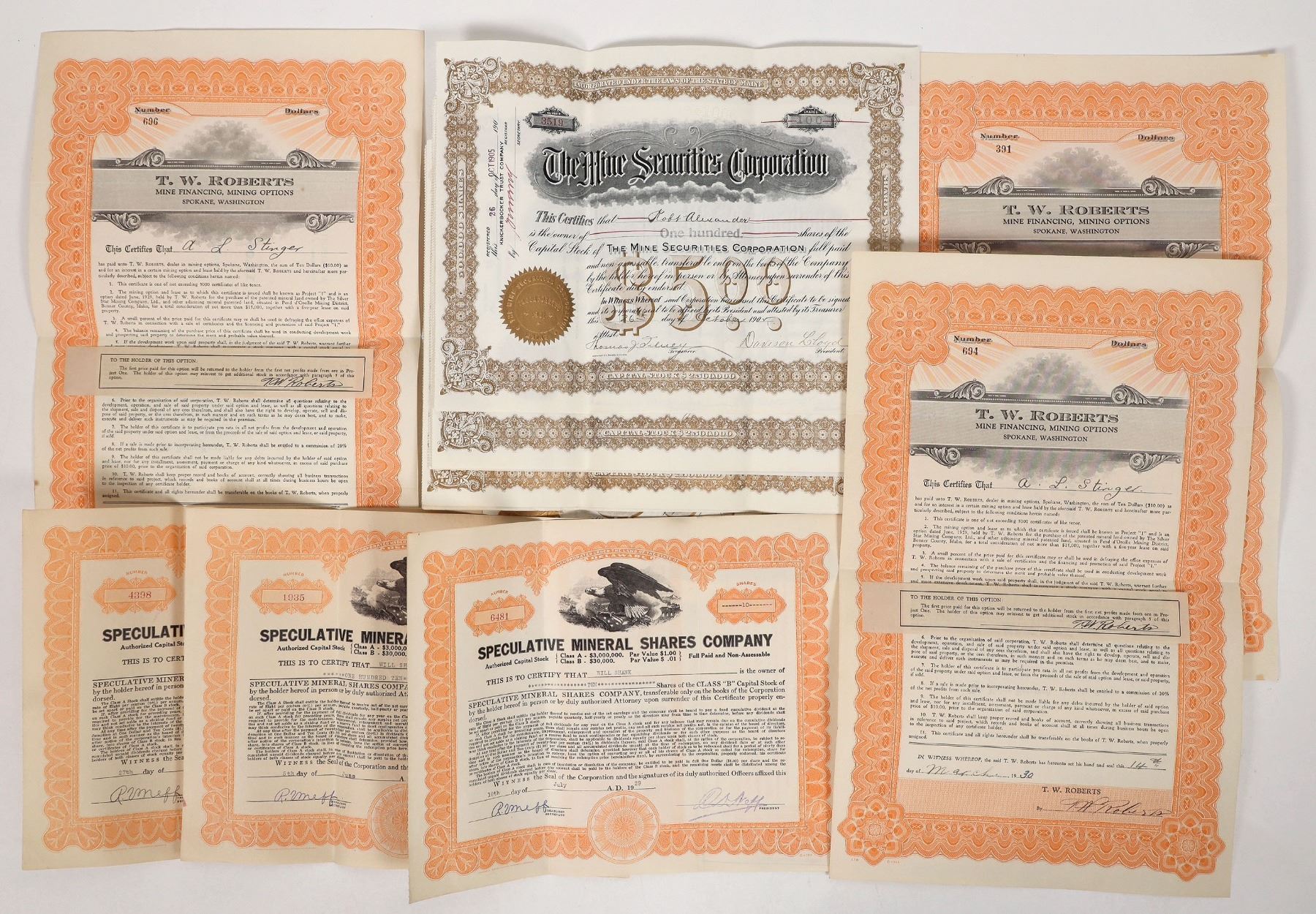 A collection of 24 stock certificates from three mining finance companies: the Speculative Mineral Shares Company (3), T.W. Roberts Mine Financing Options (3), and the Mine Securities Corporation (18). Speculative Mineral and Mine Securities certificates are each signed by secretary and president of their respective companies; T.W. Roberts certificates are signed by T.W. Roberts. Speculative Mineral and Mine Securities certificates bear embossed company seals. All have creasing from storage but are otherwise in good condition.