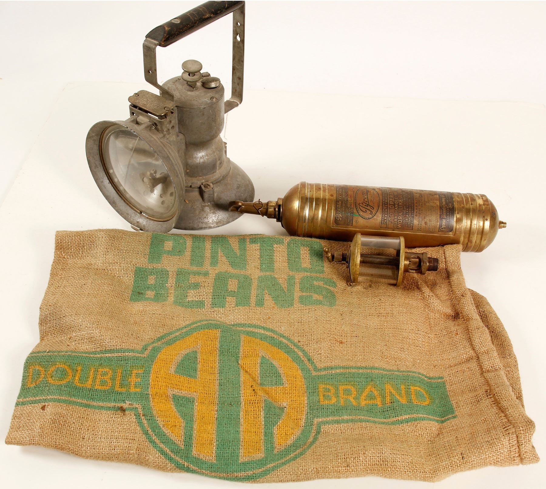 Brass hand pump extinguisher by Pyrene 14.5", Michigan Lubricator oil gauge with cracked glass, Model A white metal lamp with cracked lens 11" tall