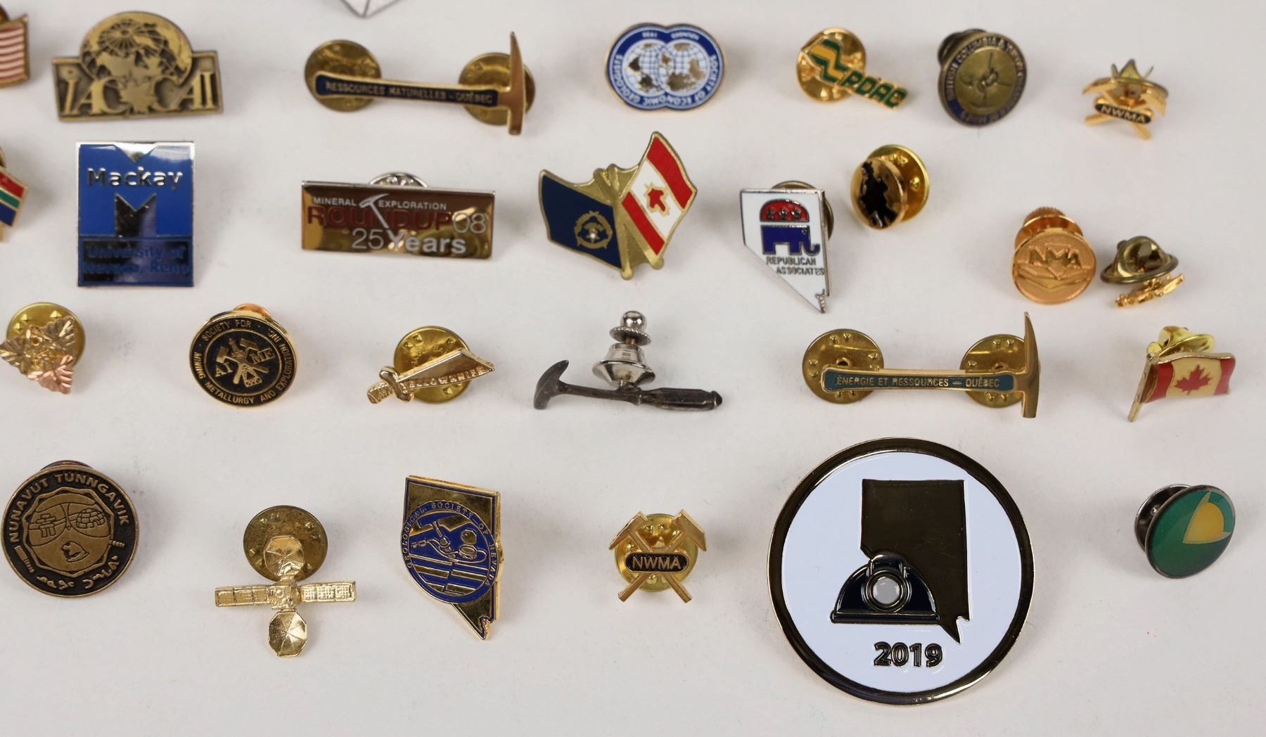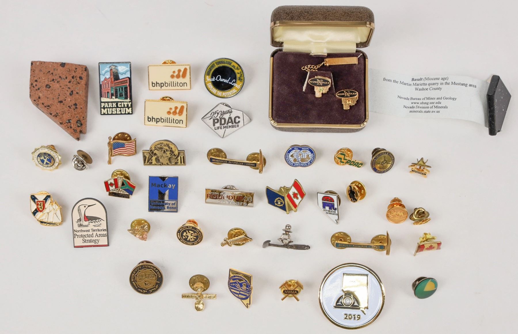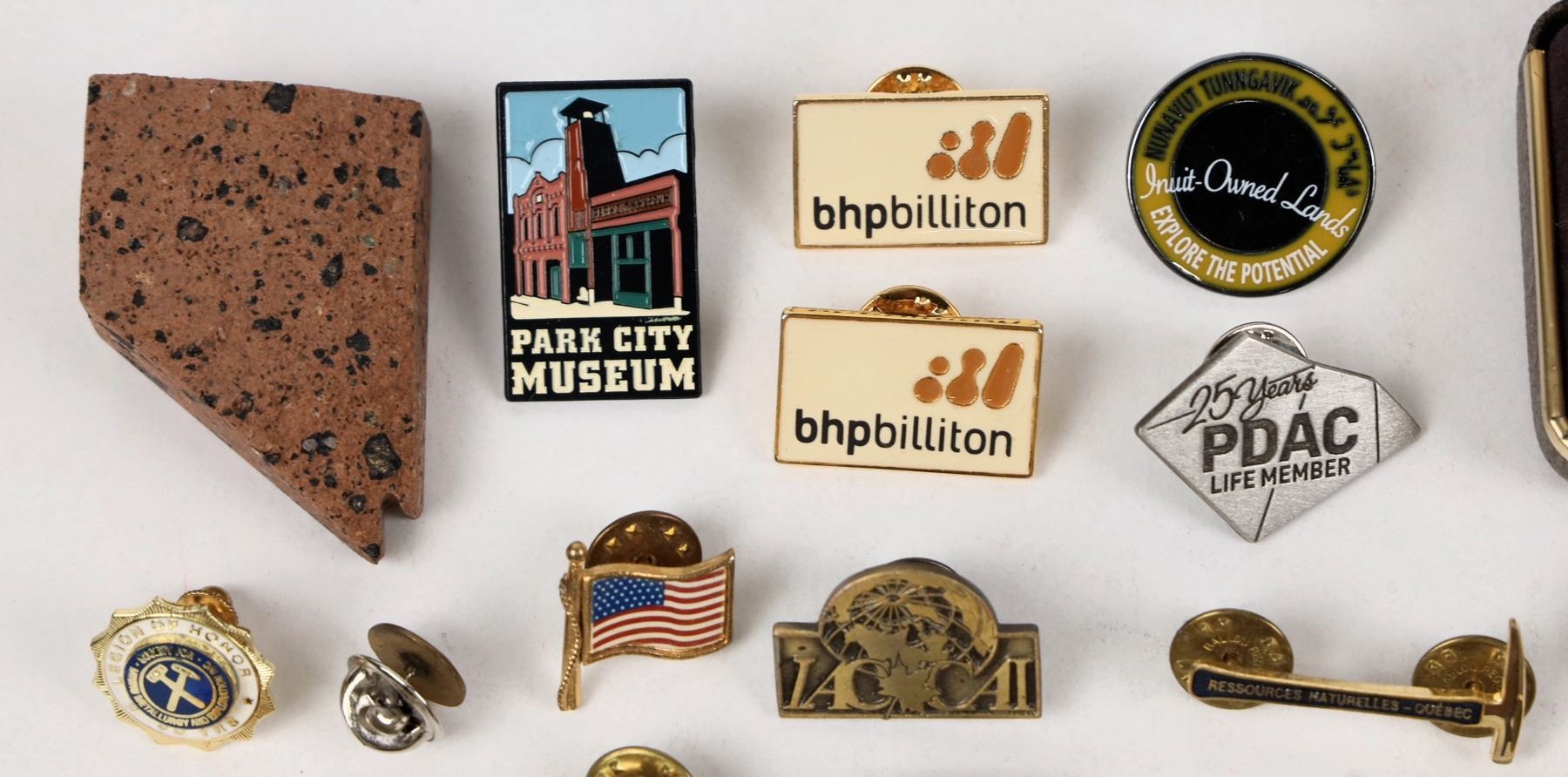 An interesting collection of lapel pins from Dave Shaddrick's collection. Includes Homestake mine, many mining and mine equipment companies, and more. About 50 pieces.